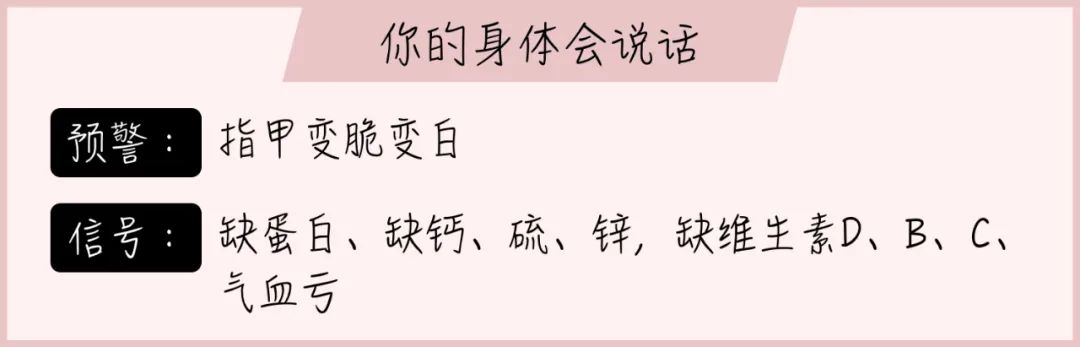 一般出现这种情况,身体就会反映在指甲和头发上,发丝非常容易断裂,指甲也会变得比之前脆软,发白,失去光泽。