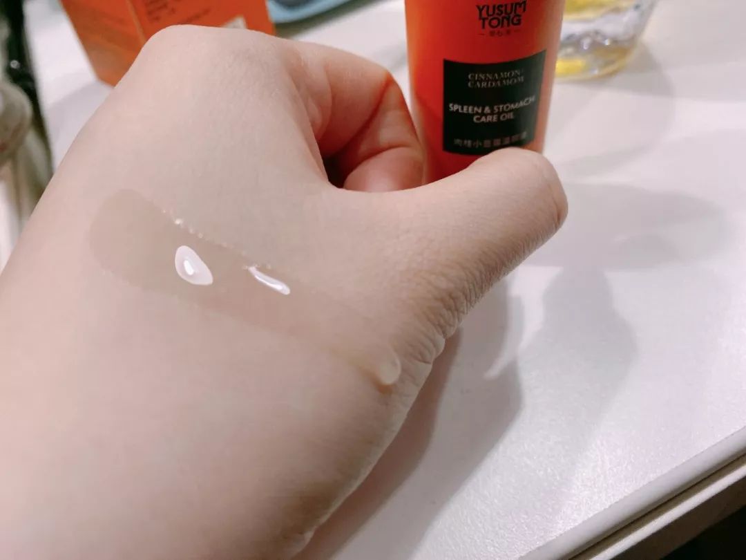 温脘油质地清透,流动性强,油膜感不重,很好吸收,不会腻在肚皮上。