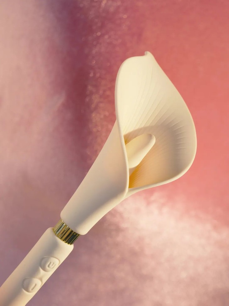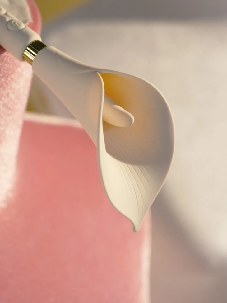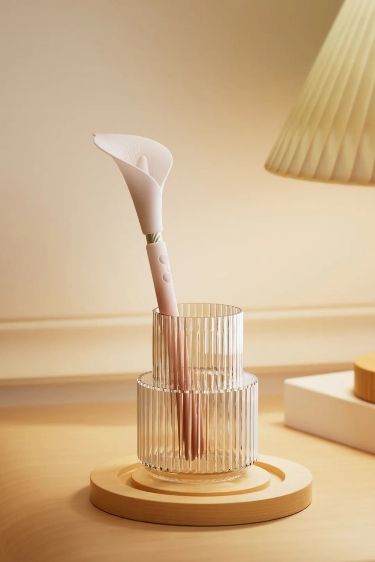 整体是一支优雅又生动的马蹄莲造型,风格简约,枝干纤长,握着很趁手,全身都是柔软的硅胶材质。