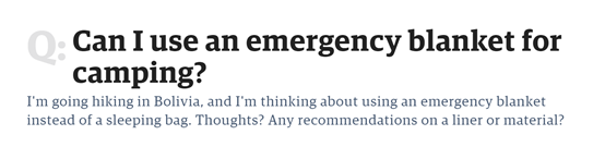 许多人也会用急救毯作为登山靴、手套、衣裤、甚至是睡袋的绝缘衬里,这是一种非常有效的保暖方式,仿佛在你身体和急救毯之间还有一层衣服。