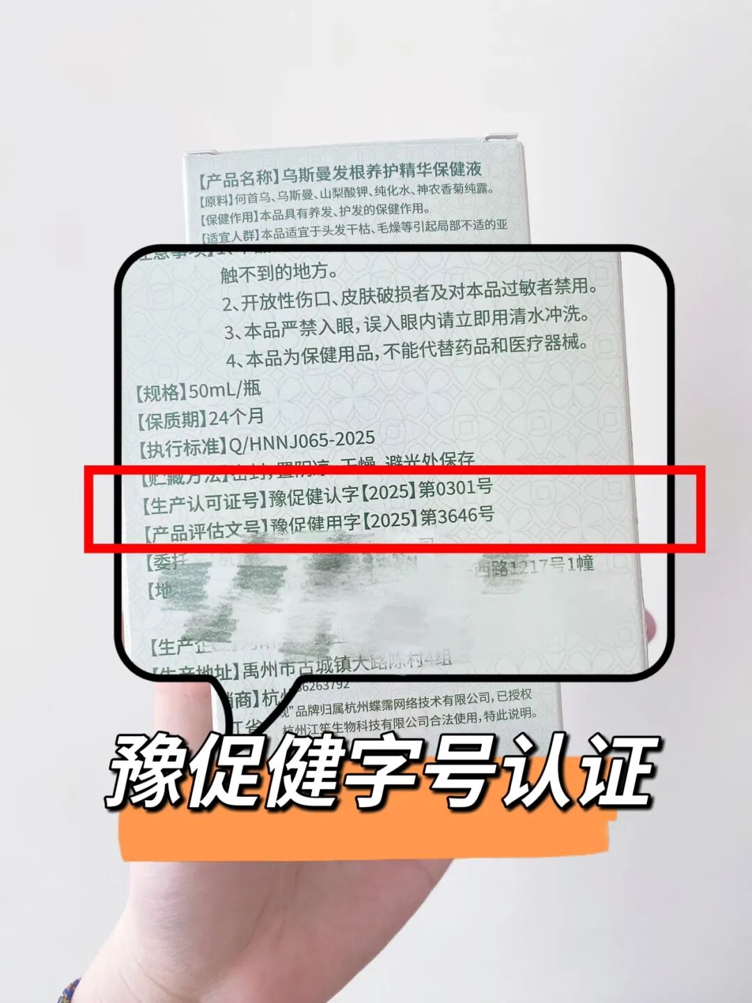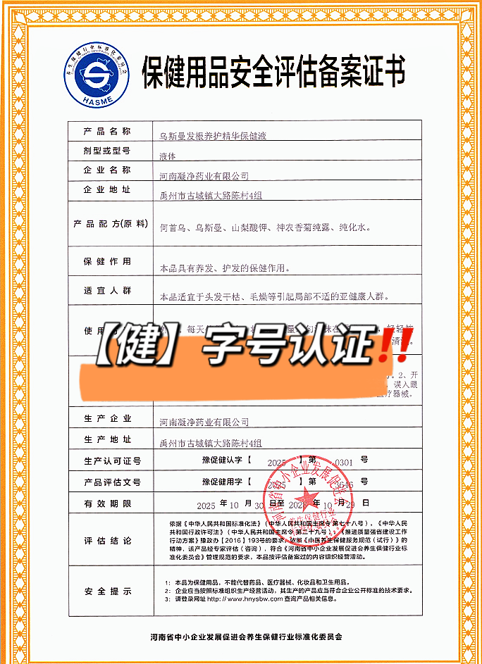 我们这款乌斯曼发根养护精华保健液,拥有国家健字号证书,这意味着它具有明确的养发、护发保健作用,经过严格审批,安全更有保障!