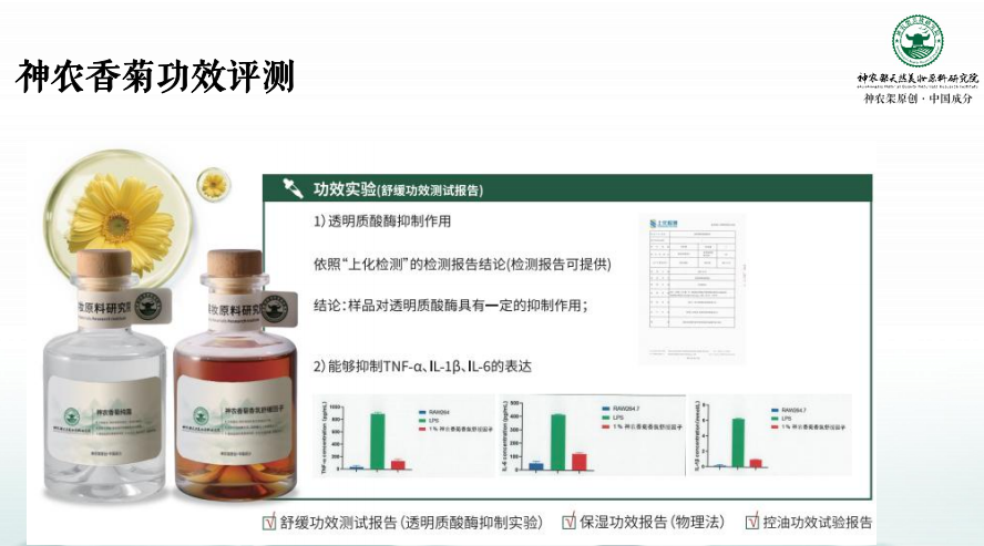 通过数据检测和临床研究,神农香菊香氛舒缓因子在亢炎亢敏功效有明显优势。