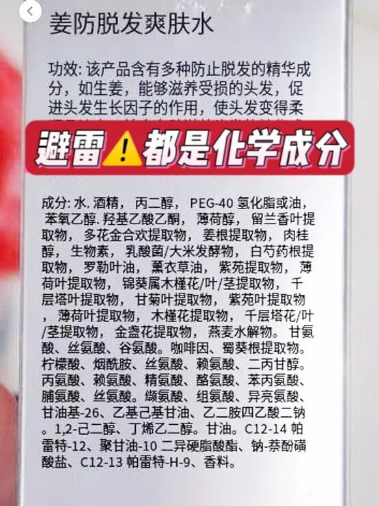 市面上大部分生*发液的成分表,“米诺地尔、酒精、丙二醇...”各种刺激性化学成分,虽然短期刺激毛囊,但长期使用导致头皮红肿、脱屑、依赖性强。