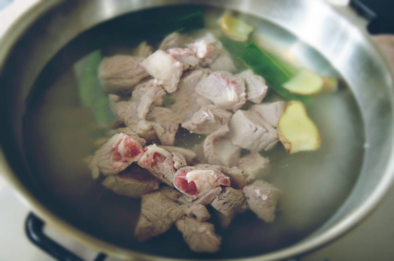 3、锅内加入清水、葱段、姜片,烧开后,放入羊肉,再次开锅后,焯水3分钟,捞出控水备用;