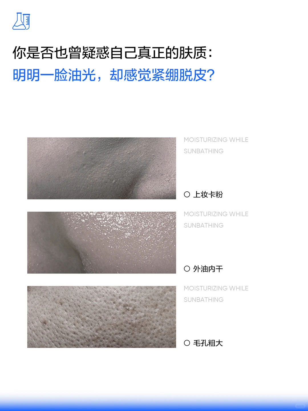 其实是当皮肤屏障受损时,皮肤误以为皮脂膜太薄,于是拼命分泌油脂,形成“油光满面”但受损的皮肤屏障,依旧无法锁住水份,从而变得内干,出现卡粉紧绷