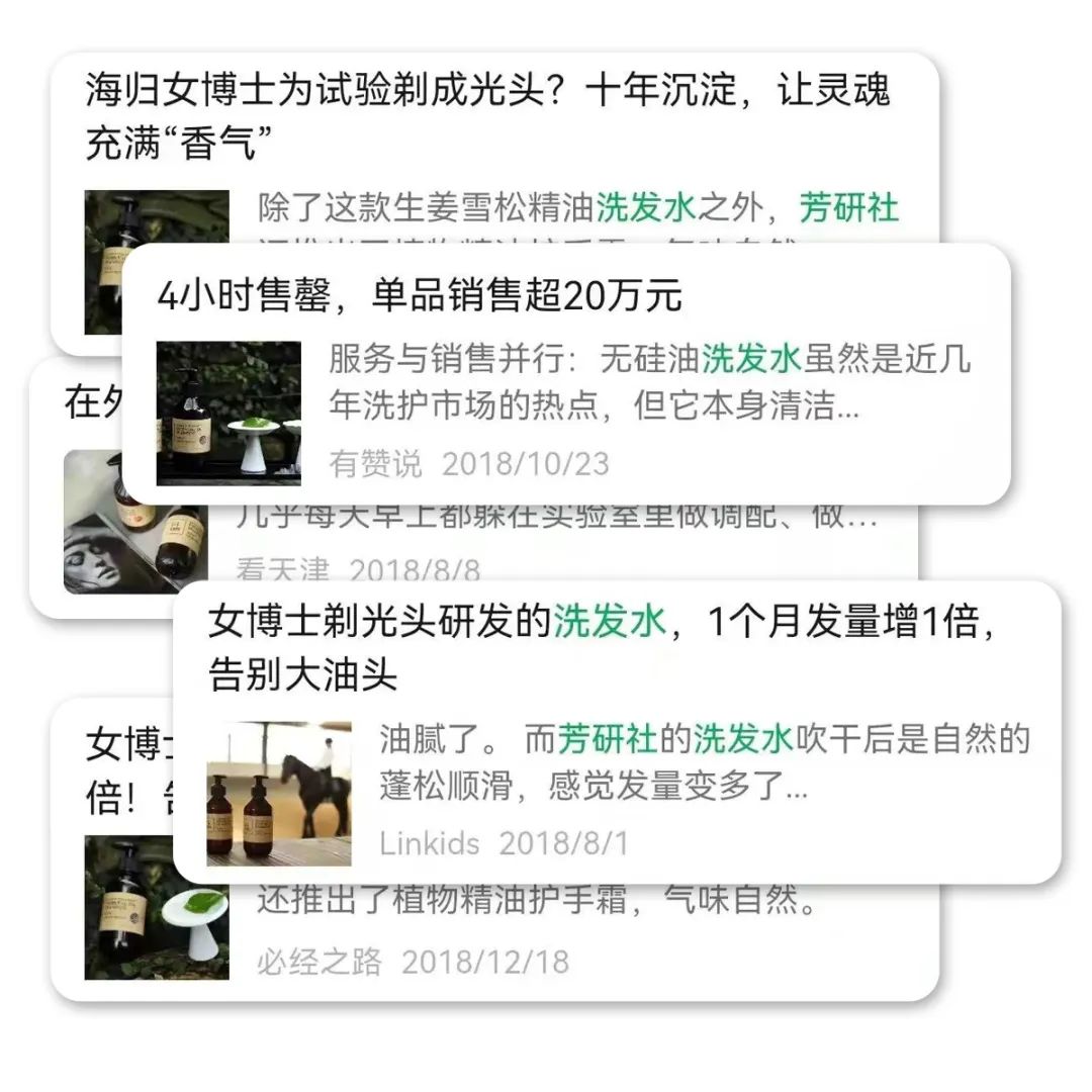 这一年,”女博士剃光头研发洗发水“的故事被各自媒体竞相转载,芳研社也因此入选百匠大集、上过好多次有赞头条、成为当年有赞平台一个教科书级别的案例。有很多芳友都是因为洗发水和芳家结缘的。