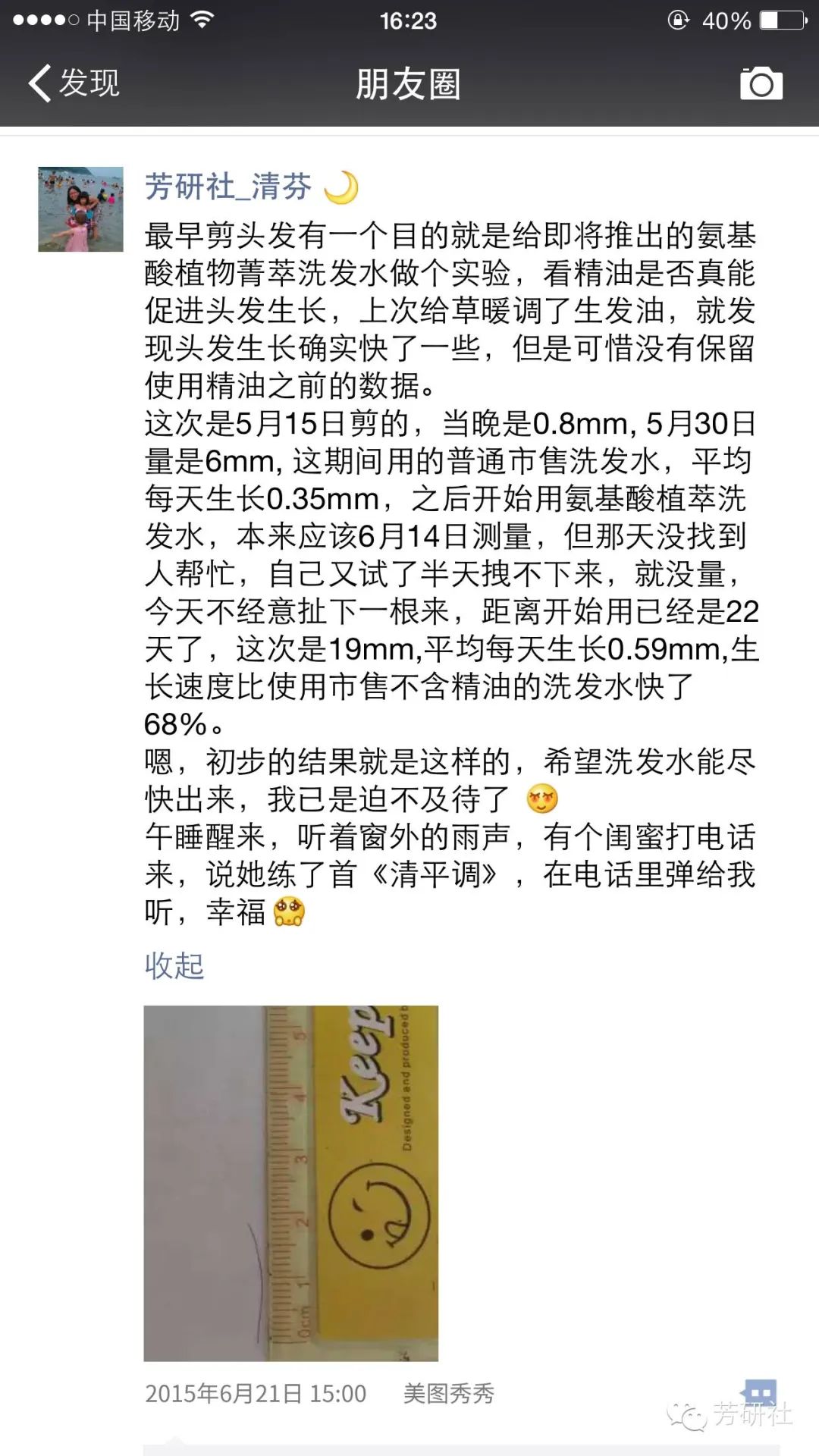 那个测试的结果也在很多地方公布过---头发生长速度变快了68%---这个数据好到我自己都不敢相信,但后来有很多芳友都告诉我,原本两个月剪一次头发,但用了芳家洗发水之后一个月就得剪一次,也有很多人反馈,用了洗发水之后新长的头发像青春期时增加的头发一样,又黑又粗壮。这样的反馈太多了...