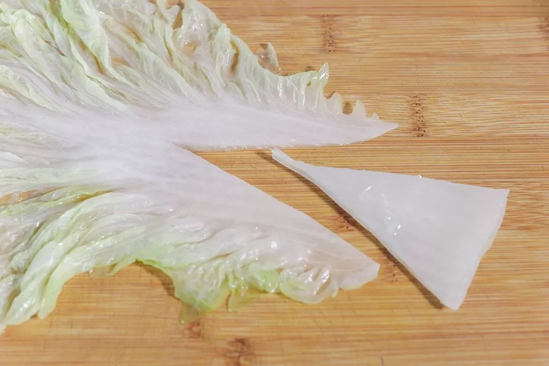 烫好的白菜放在砧板上,按照图示,在根部切去一个三角形。