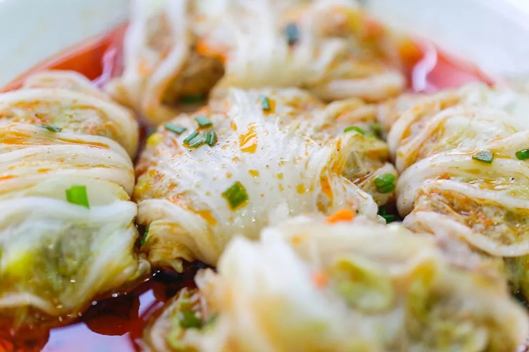 ▼ 7.品尝:做好的白菜肉卷还冒着热气,红油一淋上,瞬间让人食欲大增。