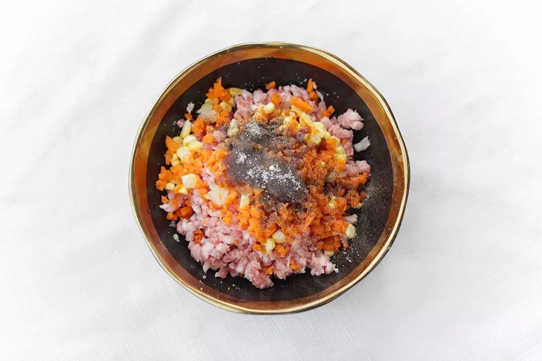 ▼ 2. 调馅:猪肉馅中加入盐、蚝油、胡椒粉和芝麻油,以及胡萝卜丁、玉米粒。