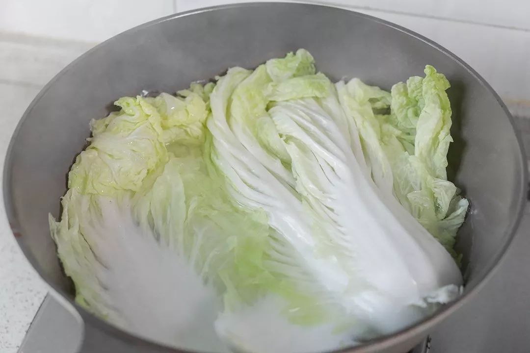 ▼ 3. 烫白菜:水中加入一点盐,烧开后把白菜放入锅内烫一下,时间不宜过久变软后即可捞出。