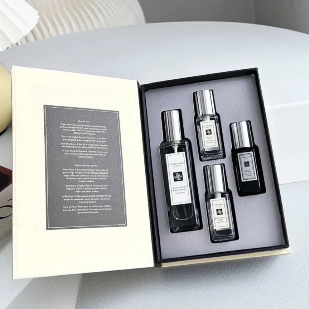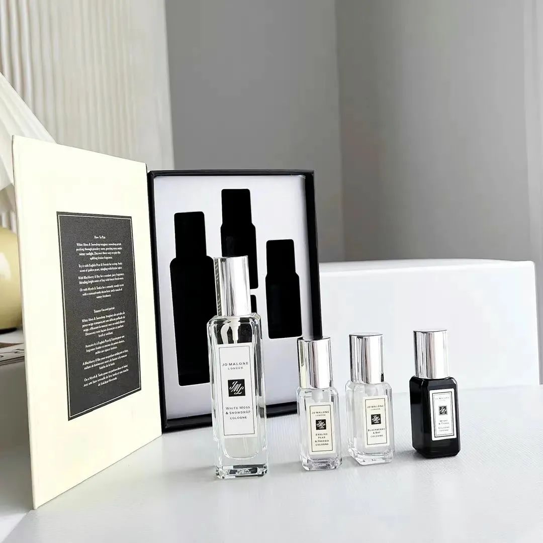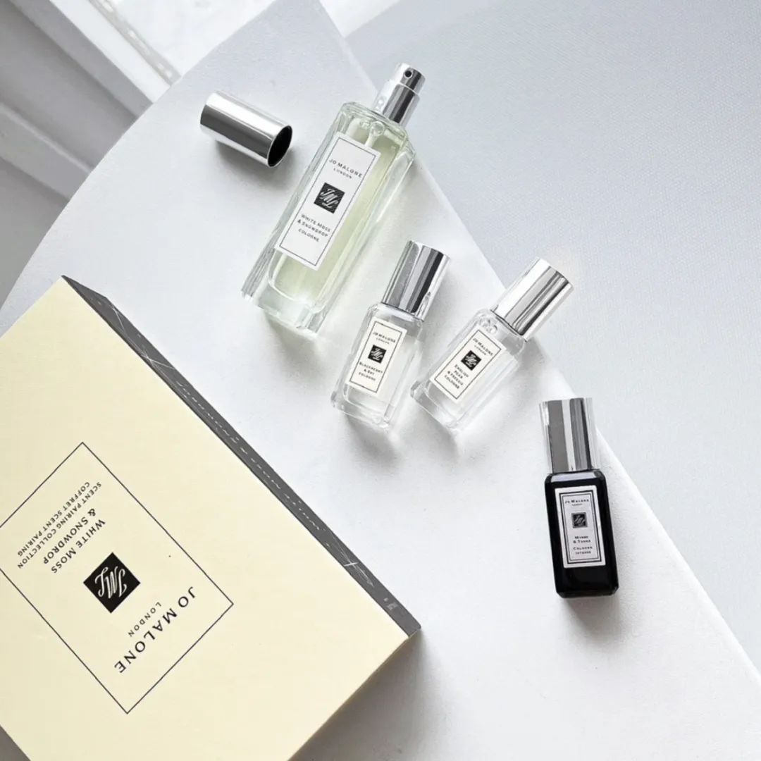 这一套祖马珑Jo Malone限定香氛礼盒:白苔与雪莲30ml+英国梨和小苍兰9ml+黑莓与月桂月9ml+末药与东加豆9ml。