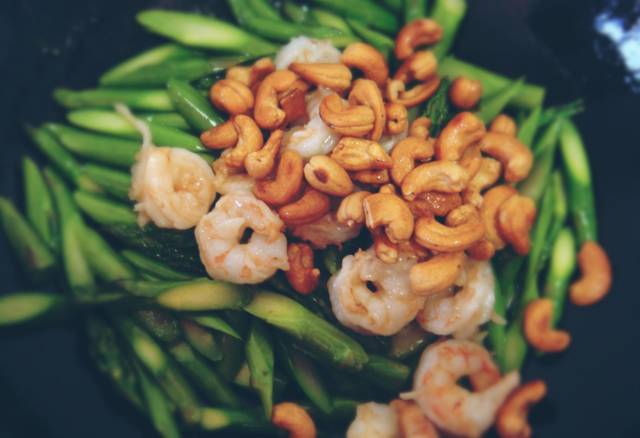 3、倒入芦笋翻炒,见颜色变翠绿,倒入虾仁和腰果一起翻炒;