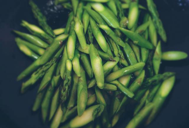 2、芦笋清洗干净,斜切成段,焯水1~2分钟,沥水备用;