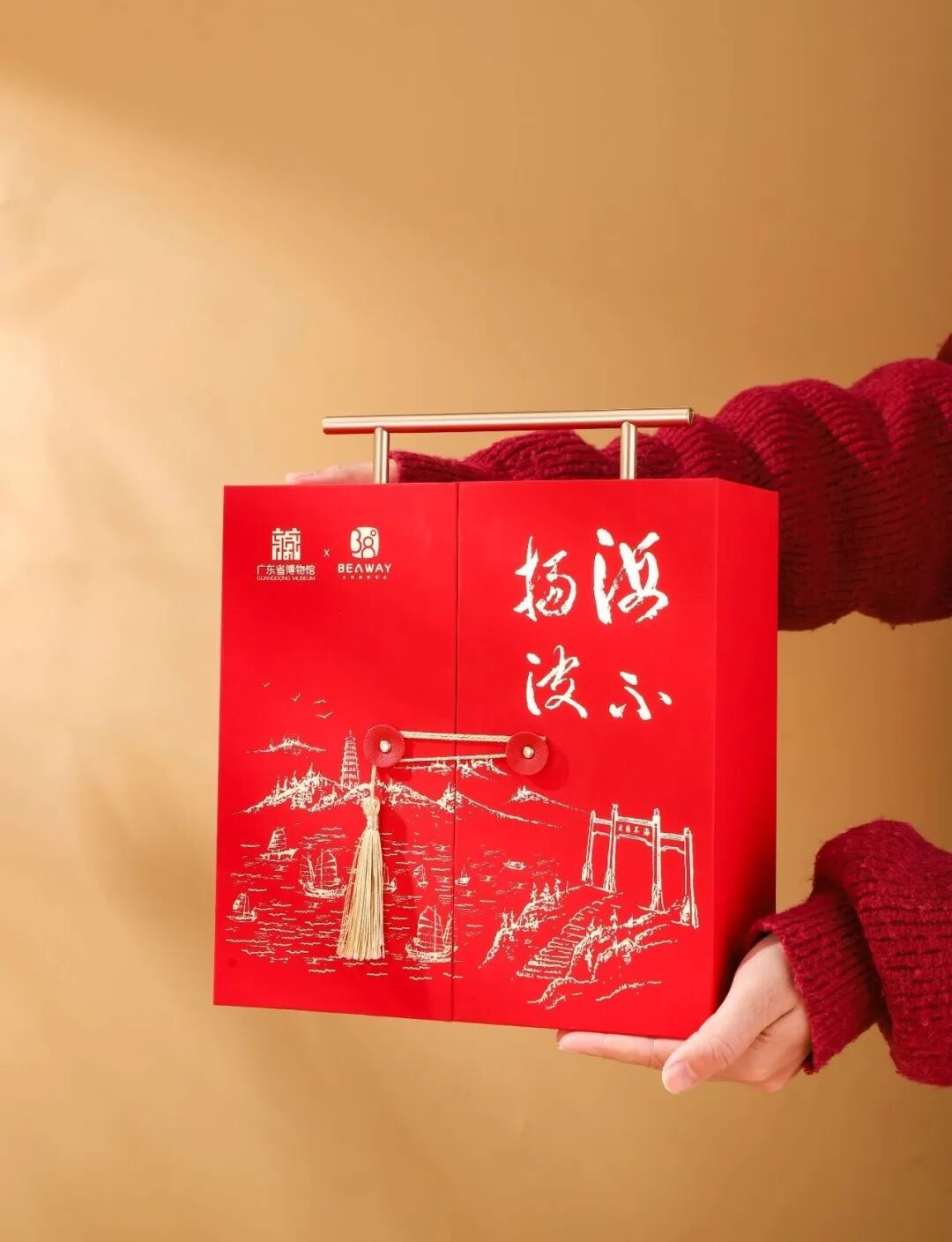 《海不扬波》礼盒,灵感源自广东省博物馆海上丝绸之路主题馆藏"海不扬波"碑刻、广船模型与《琶洲塔》油画。