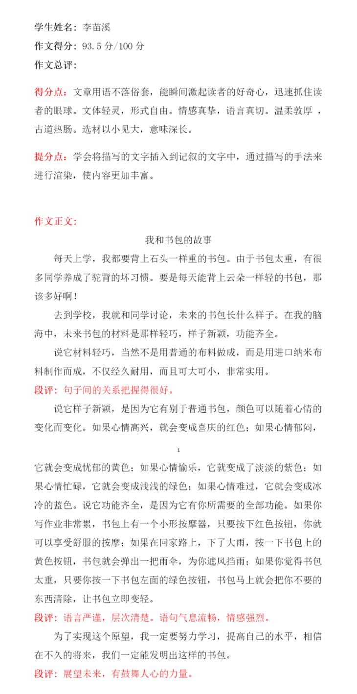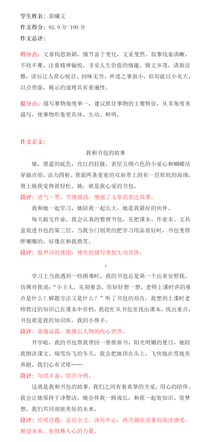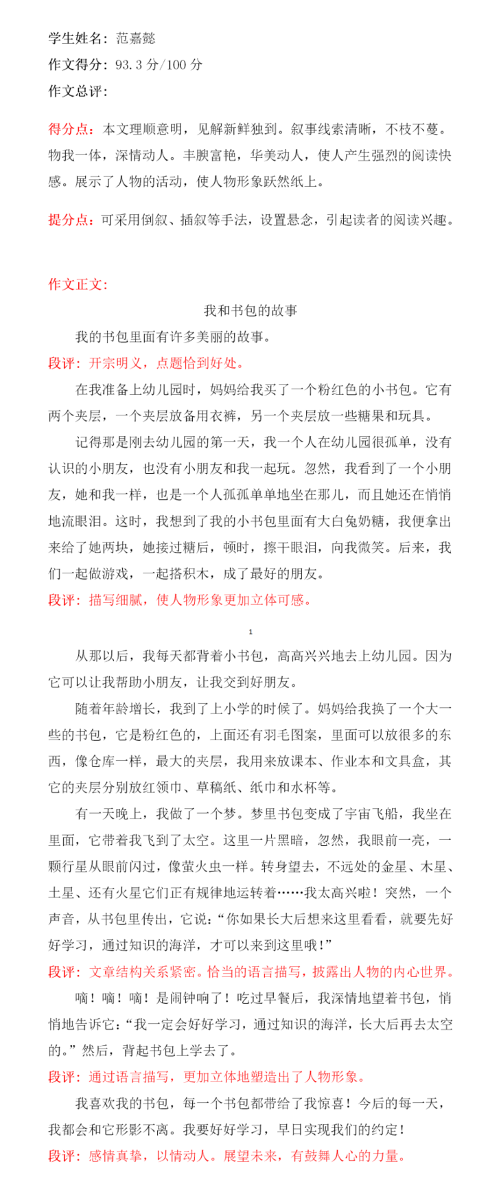 这是一篇写书包的文章,小作者先对书包的外形进行描写,语言细腻;接着围绕书包和她之间有趣的故事和爱护书包进行详写,由表及里,层层深入,思路清晰,详略得当。文章最后直抒胸臆,表达了她对书包的喜爱之情。