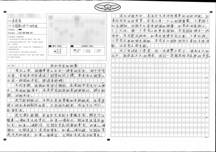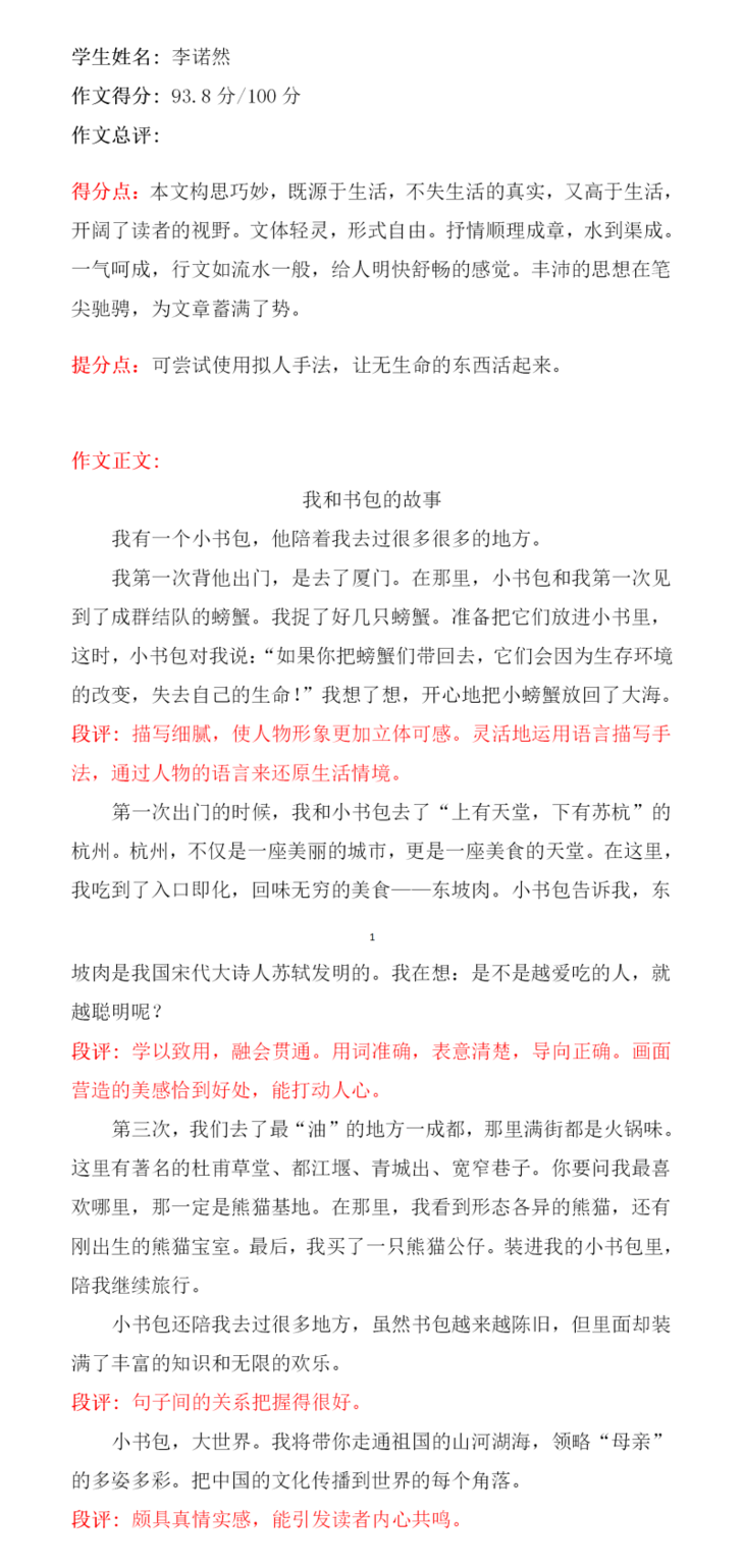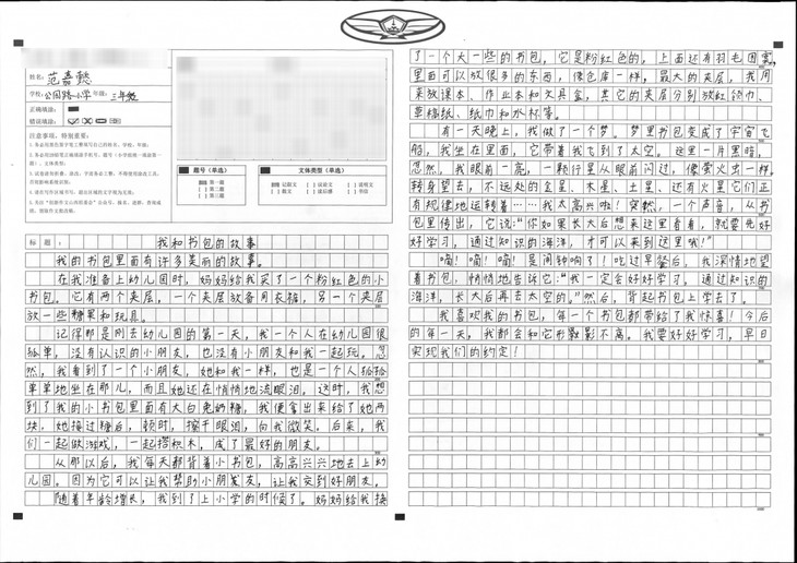 小作者用生动活泼的语言,按照时间的发展顺序向我们介绍了她从幼儿园到小学书包和她之间有趣的故事,字里行间都透露着她对书包的喜爱之情。文章构思巧妙,叙述完整生动,最后直抒胸臆,表达了她乐于助人,热爱学习,积极向上的生活态度。