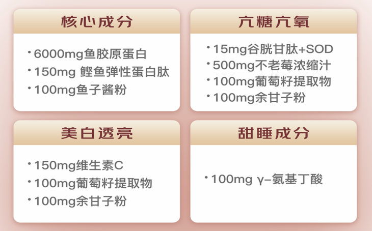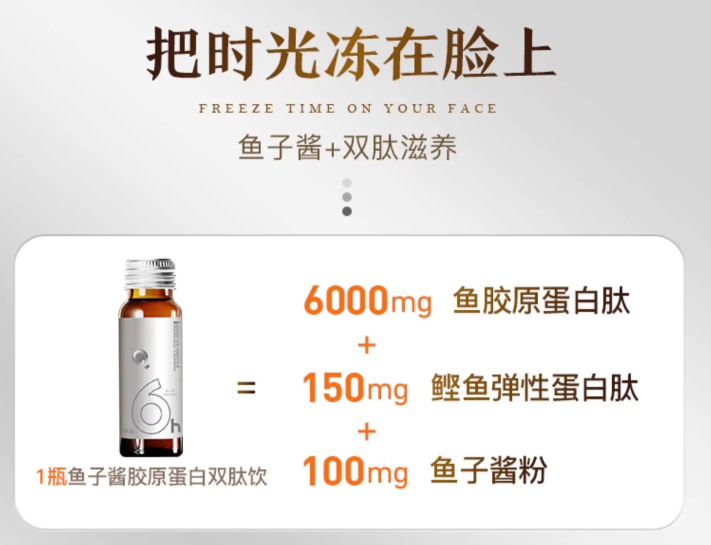 除了胶原蛋白肽以外,这款饮品还有其他营养成分,足量添加,达到复配效果。