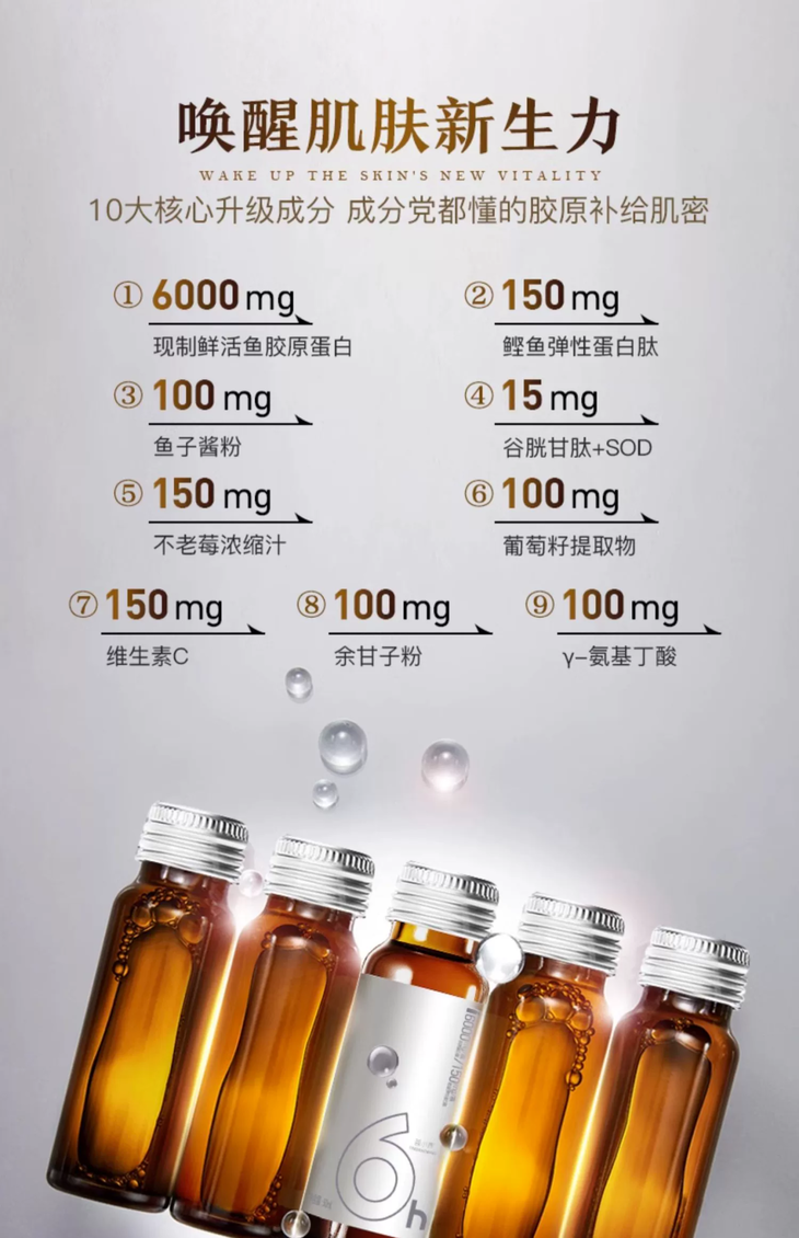 每瓶含有6000mg足量胶原肽,为肌肤高能补给,深度滋养焕亮新颜,由内而外深度润养胶原肌。1000道尔顿液体小分子胶原蛋白肽,易于吸收