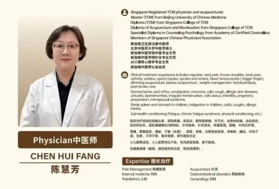 医师2:陈慧芳中医师,中国台湾人,北京中医药大学中医学硕士,新加坡中医学院中医学专业及针灸专业文凭,ACC辅导心理学专业文凭,属新加坡注册中医师,新加坡中医师公会会员,临床经验30年,擅长内科、妇科、儿科、疼痛、针灸;