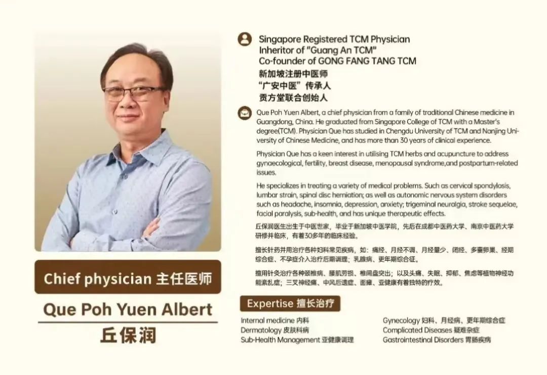 医师1:丘保润主任医师,是诊所主诊医师,属新加坡注册中医师,也是新加坡老字号“广安中医”传承人,更是贡方堂新加坡诊所联合创始人,临床经验40年,擅长治疗中医内科、妇科、皮肤科,疑难杂症和亚健康的调理;