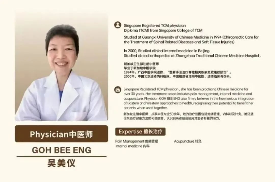 医师3:吴美仪中医师,毕业于新加坡中医学院,进修于广西中医学院、福建漳州中医院,属新加坡注册中医师,临床经验20年,擅长内科、疼痛、针灸、手法。