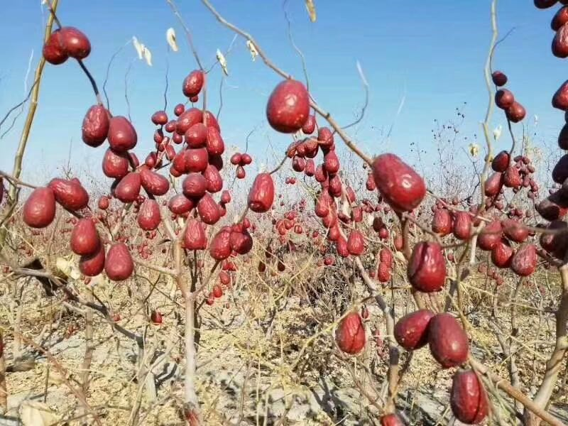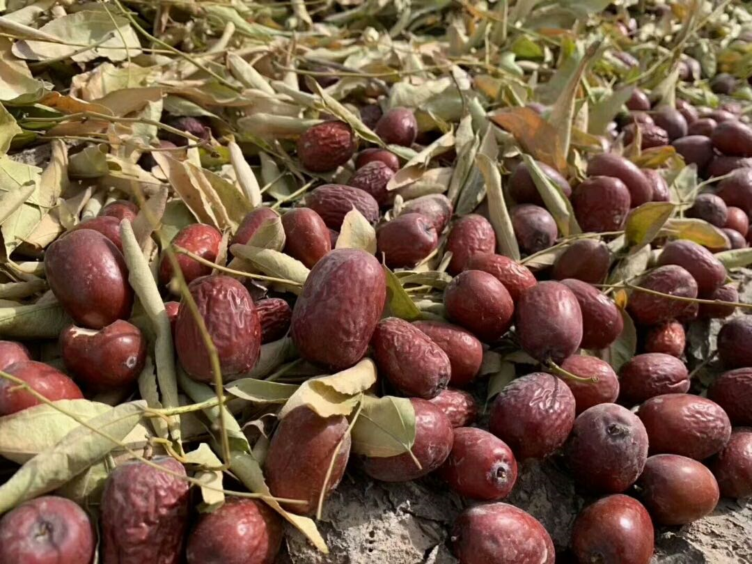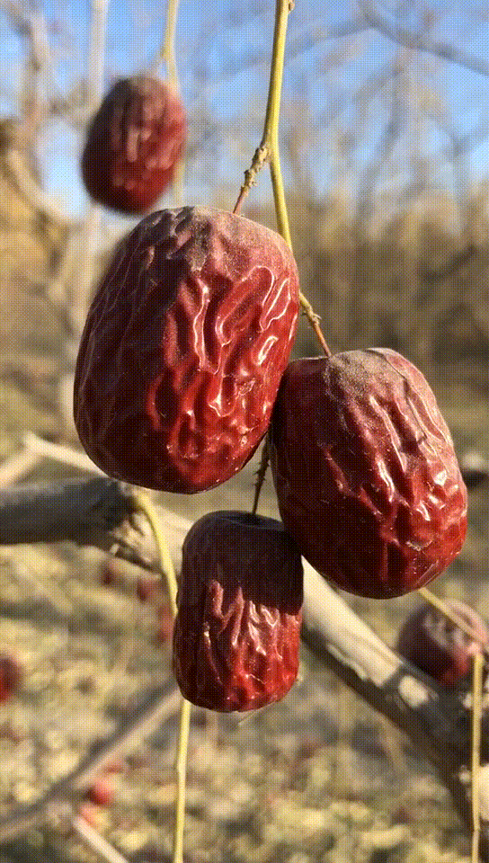 收获时,只要轻轻摇晃果树,枣子就像落叶一般簌簌落地。刚刚采收的灰枣,表皮还带着戈壁滩的风沙。直接用手擦一擦上面的浮灰,深红色的枣果,咬一口,厚实的枣肉,慢慢咀嚼,枣肉细腻醇厚,夹杂着枣子的香气,满满的幸福感!