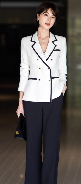🌸谁能拒绝一套又美又飒的西装套装呢?这款白黑配色的战袍,一穿上就气质飙升~白色西装的纯净搭配黑色包边的利落,简直是时尚与专业的完美融合😎