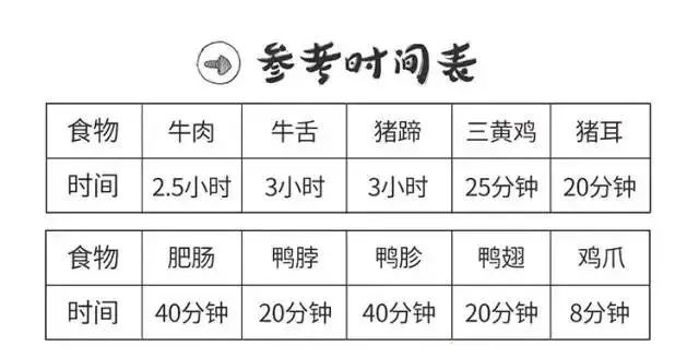 大火烧开,依次下入喜欢的食材,转小火加盖炖煮(不同食材卤制时参考时间表)。