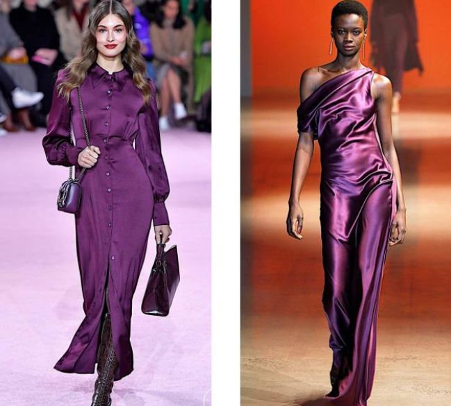 有紫色调的性感,又有粉丝调的柔和。秀场上黑加仑紫长裙高贵大气,气场全开,这种紫色穿着时,露出大面积的肌肤才好看。