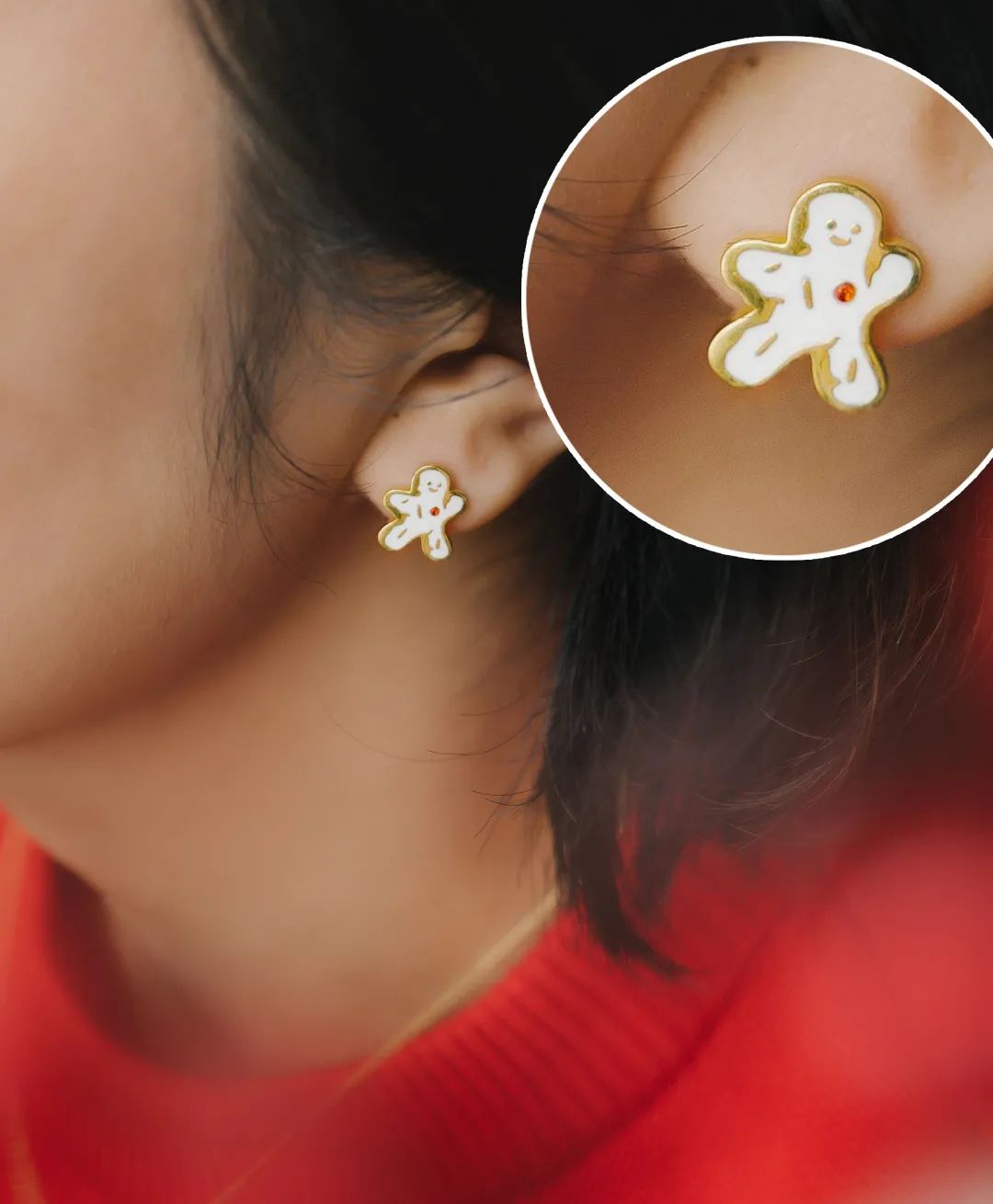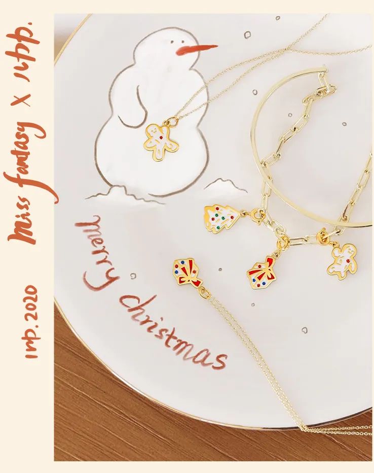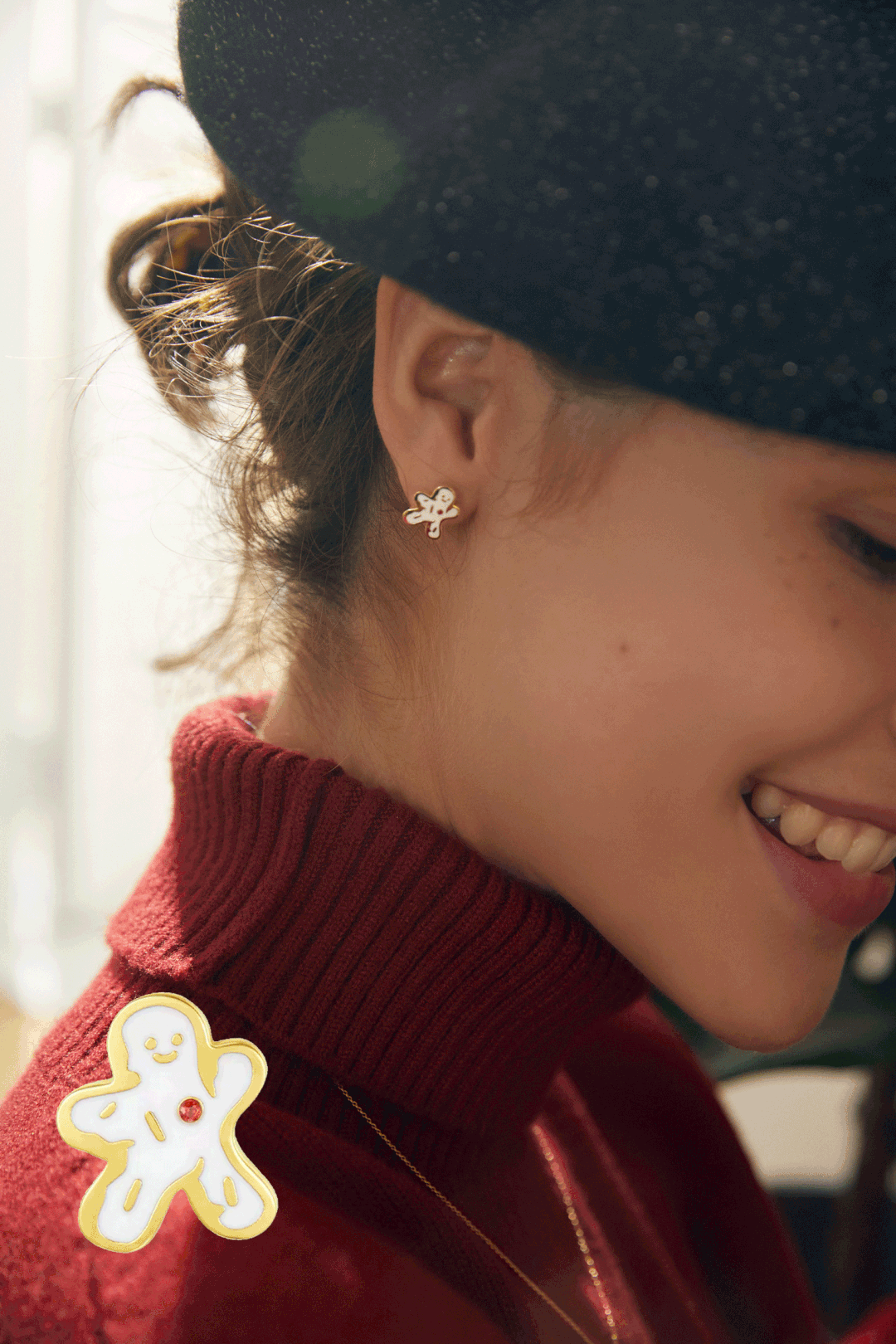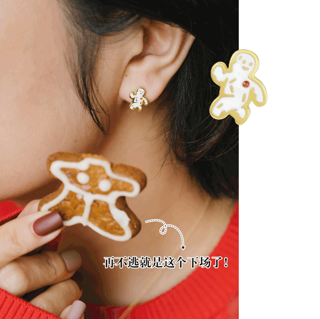 第一个推荐的当然是首饰,灵感是她的圣诞小漫画,叫“姜饼人冒险记”:一只刚被烤好的姜饼人悄悄离家出走、跑出去闯江湖了~