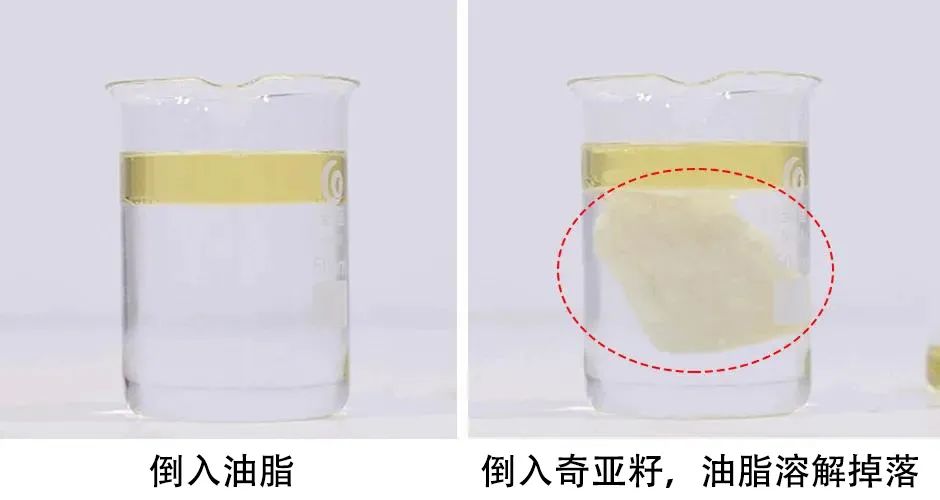 我们特意用食用油做了个实验,将食用油加入奇亚籽膳食纤维中,油脂慢慢就被溶掉了,刮油效果很不错!