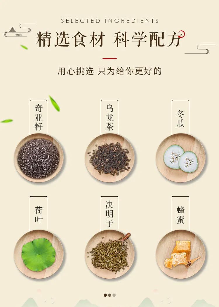 原料都来自国内外优越的产地,进口奇亚籽、杭州荷叶、云南冬瓜、福建乌龙茶、安徽决明子、江西芡实、山东玫瑰花,也是好品质的原因之一。
