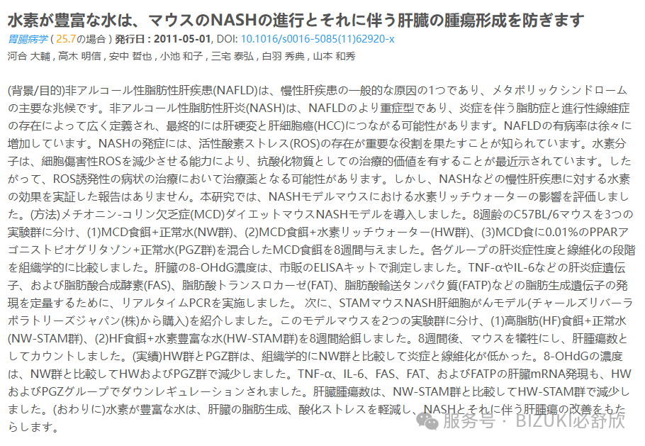 日本学者Daisuke Kawai及其团队于2011年在《Gastroenterology》期刊上发表了一项研究,主题为“富氢水对非酒精性脂肪性肝炎(NASH)进展及伴随肝肿瘤的预防作用”。研究发现,饮用富氢水的小鼠肝脏炎症和纤维化程度显著减轻,氧化应激标志物8-OHdG浓度降低,脂肪生成基因表达下调。此外,富氢水还减少了NASH肝癌小鼠模型中的肝肿瘤数量。研究表明,富氢水能够有效改善NASH及其相关肝肿瘤。