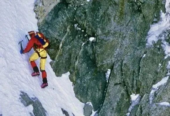 Christopher Profit穿着MILLET觅乐第一件专业的Gore-Tex连体登山服Pro Model Profit谱写了阿式攀登史的传奇篇章——阿尔卑斯三部曲冬季连攀。