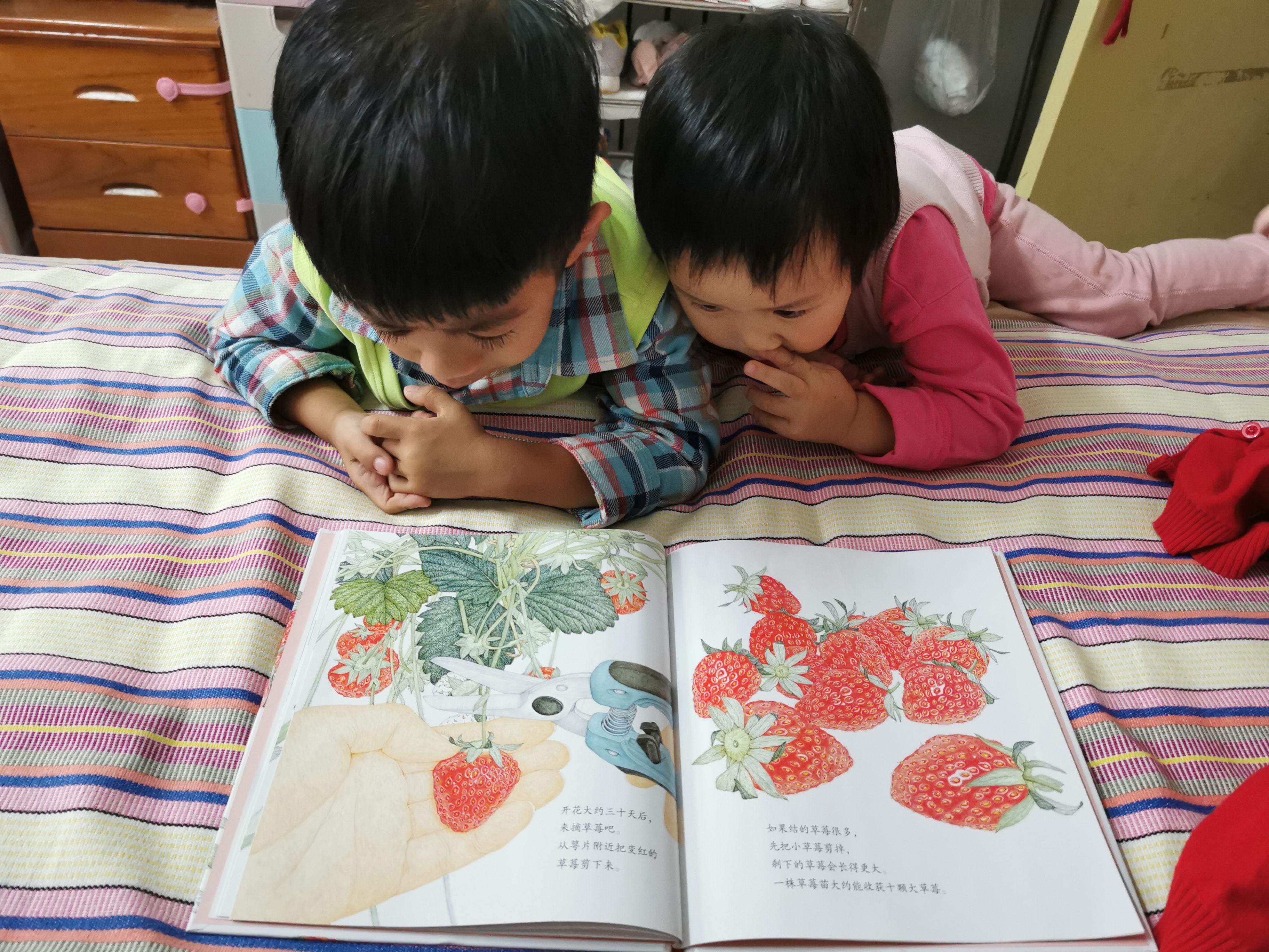 这本书真是太赞了,孩子爱吃草莓,书中把草莓的颜色形状味道气味介绍的清清楚楚,然后是草莓的生长过程,从一颗小苗长成果实,要经历很长时间,这期间我们要有足够的耐心等待花开,等待结果,然后孩子把图中最大的分给了我,我们玩起了吃草莓过家家的游戏,最后我们画一副草莓的画,让孩子回忆书中草莓生长的过程。