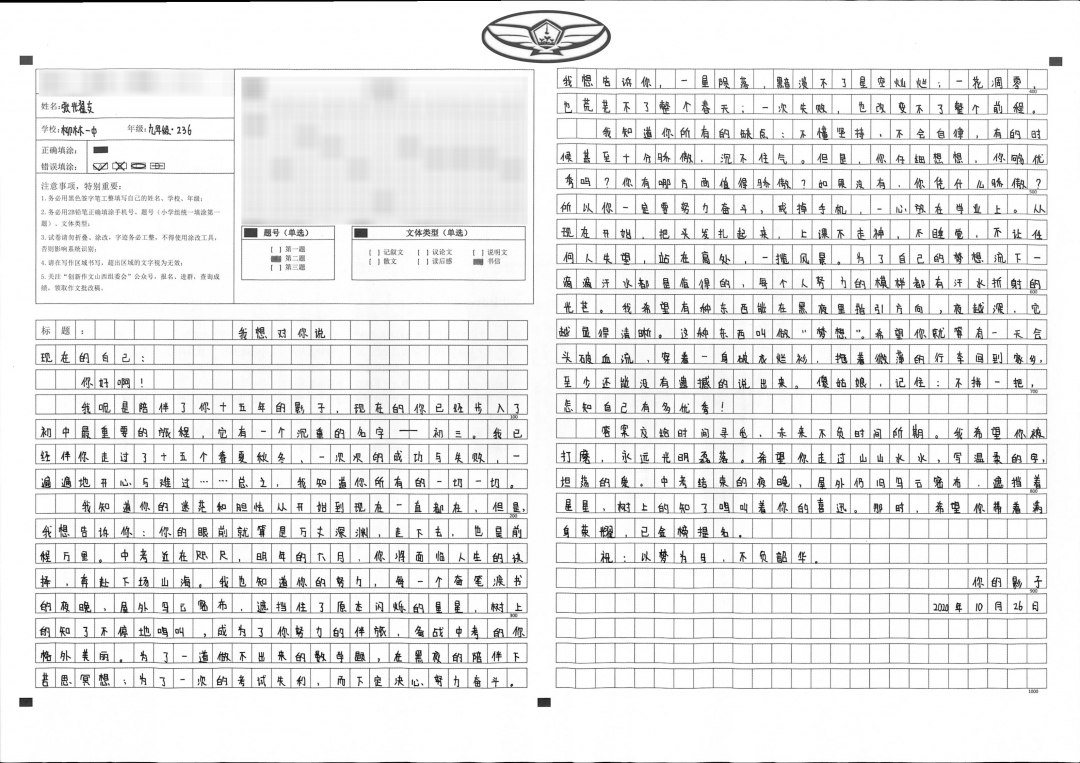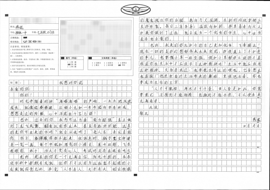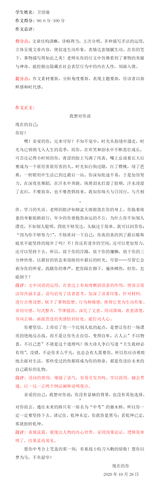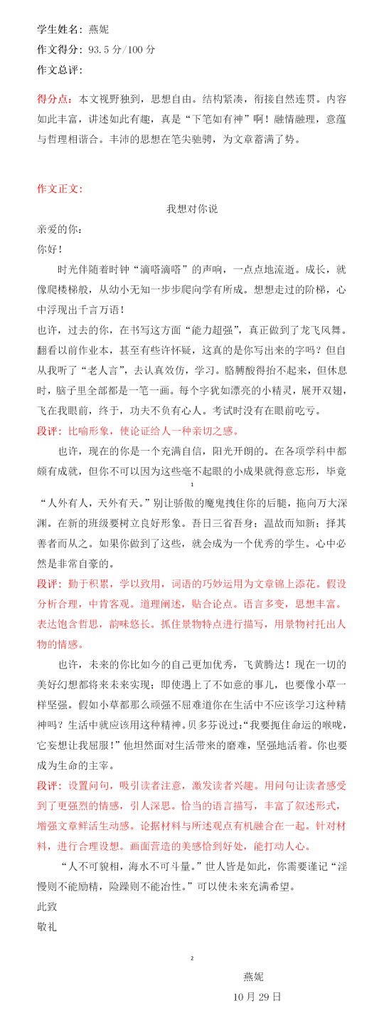 孩子从小自主独立,知礼懂事,学习勤奋,积极上进。这篇致自己的一封信是对自己的鞭策和激励,自知者明,希望孩子能正确认识自我,不馁不骄,积极进取,在人生道路上用努力书写自己的辉煌。