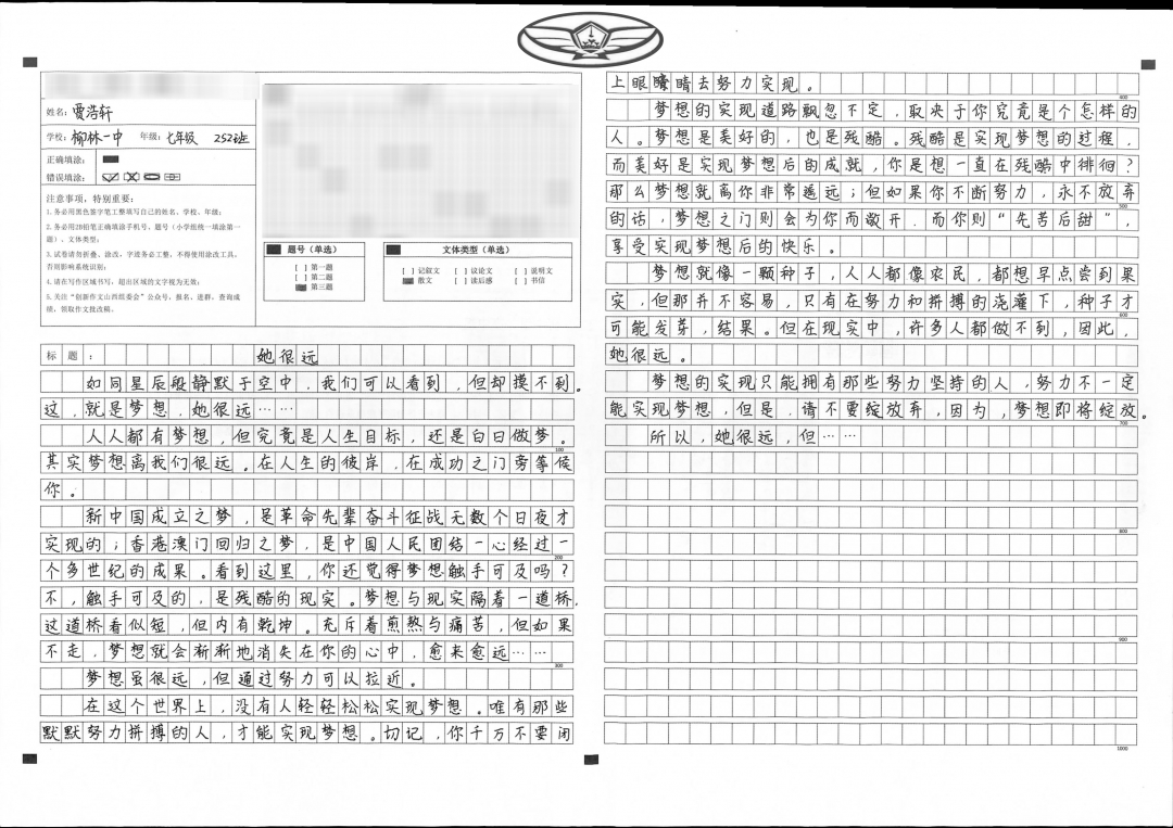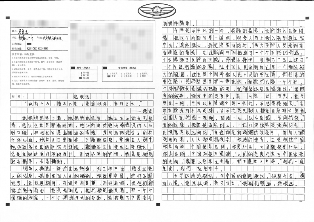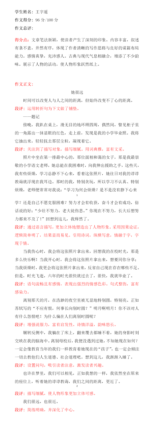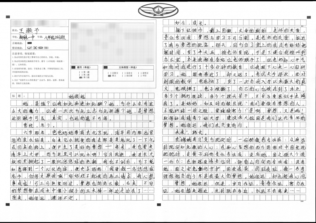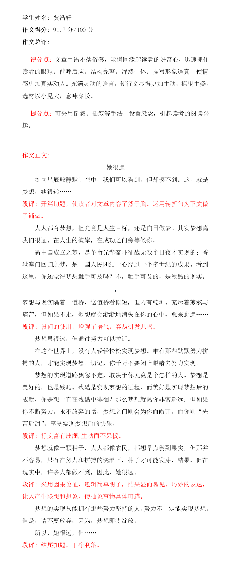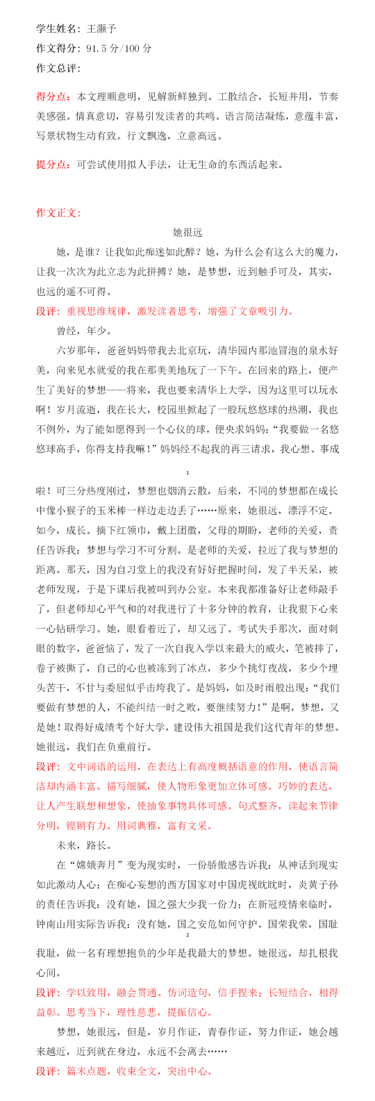王灏予文章评语:开头用“她”是谁?对她痴迷沉醉,为她立志拼搏来设置悬念,吸引读者的阅读兴趣。中间部分由不断变化到坚定不移树立建设伟大祖国的美好梦想中,见证一个人的思想成长过程,读来真实感人。而且把个人梦想与国家的富强、人民的幸福联系起来,充满社会责任感,很了不起。结尾,为“她”努力的决心坚定不移,充满正能量。