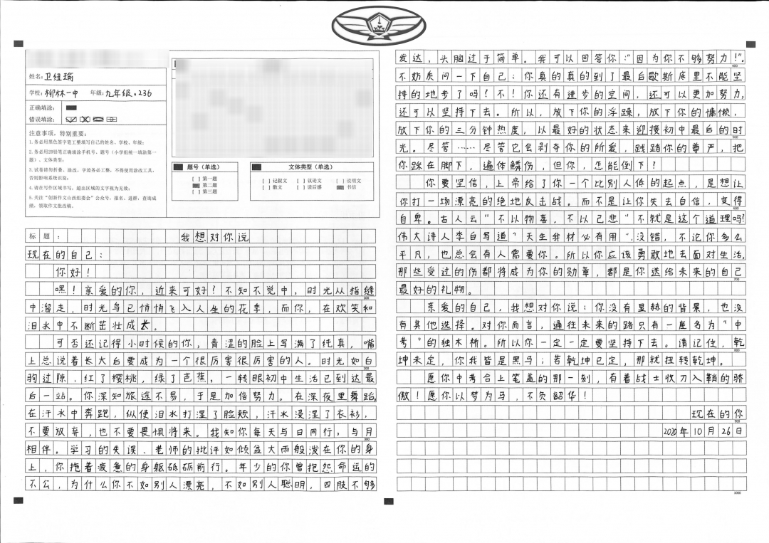 大家好!我是柳林一中九年级的一名学生,我不算太优秀,这次征文比赛看到作文题后,想对自己说的话都涌上心头,便写下了这篇文章。步入初中后才发现小学认为自己优秀的时候有多么幼稚。现在我努力改变着自己,让自己变优秀,这篇文章也是我的承诺。希望明年栀子花开时节我可以身披满身荣耀,谢谢大家!