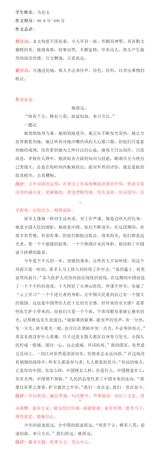 这篇文章刚开始构思时,就先想如何从这个“她”中入手,是写人?写事?还是写物?观察到既然是“女”字她,有何妨不写,祖国母亲呢?既符合其形象,又因疫情中,“一方有难,八方支援”的精神,给了我写作灵感。先简略形象和描述,做出悬念,然后引出主人公,分别从不同职业和状态突出其特征,从小的出发点汇聚成其要表达的大情怀。“纵有千古,横有八荒,前途似海,来日方长”中国人很远,中华少年很远,她很远,即为写作思路。