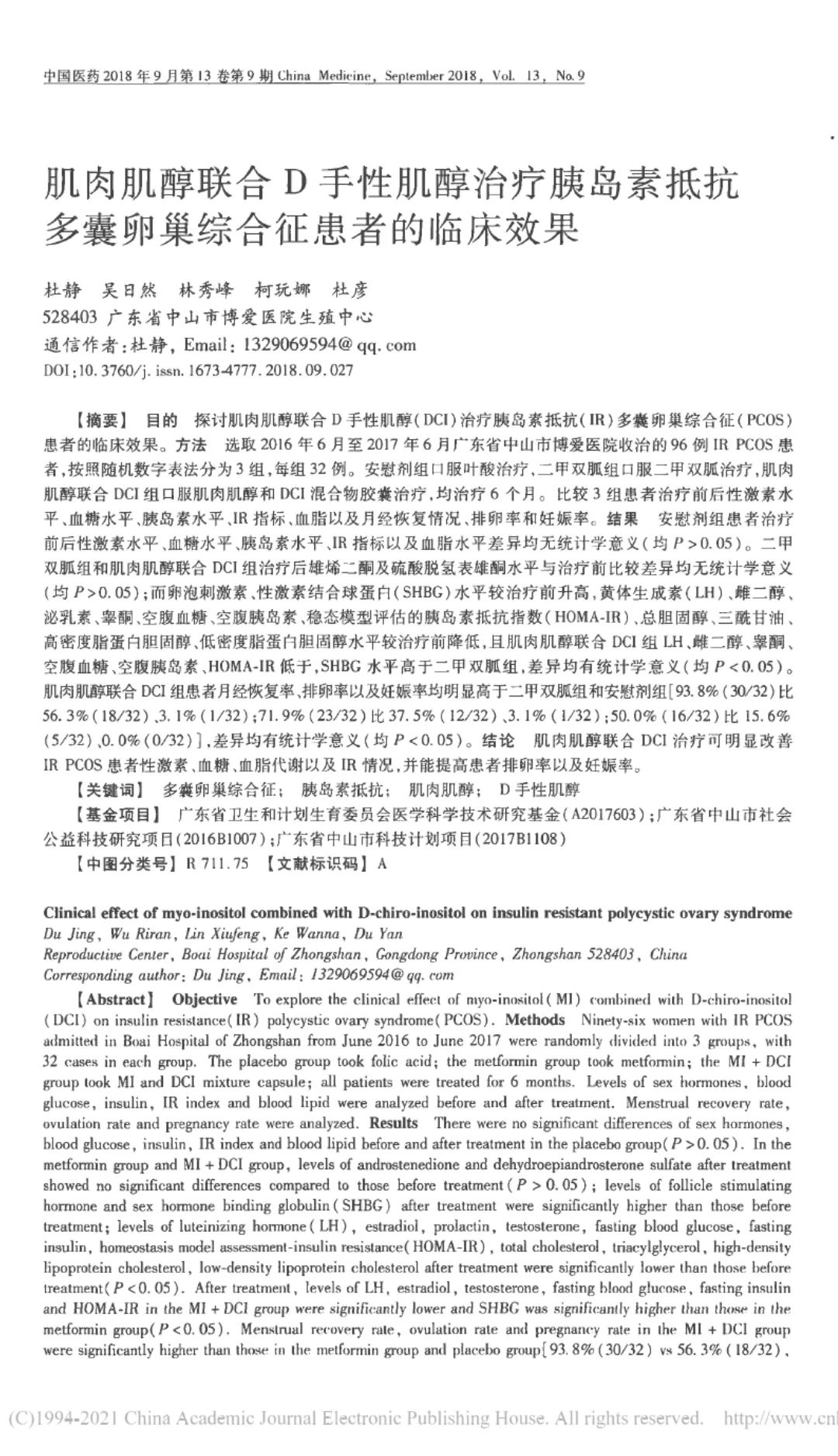 肌肉肌醇联合手性肌醇组患者的月经恢复率、排卵率以及妊娠率均明显高于二甲双胍组。 结论:肌肉肌醇联合手性肌醇治疗可明显改善胰岛素抵抗的多囊患者性激素、血糖、血脂代谢以及胰岛素抵抗情况,并能提高患者排卵率以及妊娠率。