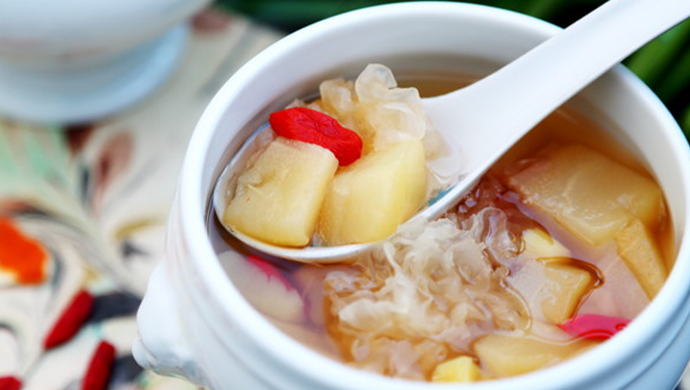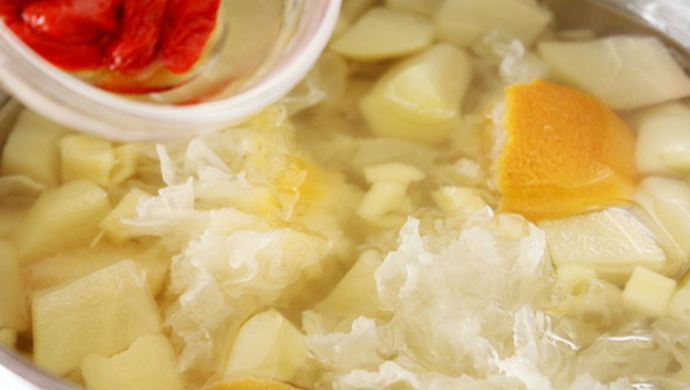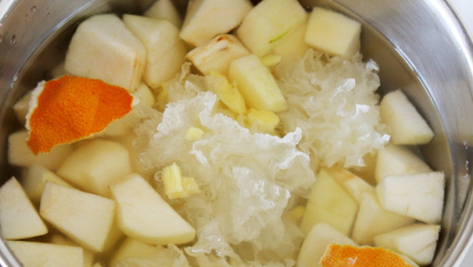 陈皮具有理气、健脾胃、化痰、润肺、止咳、通五脏的作用, 雪梨生吃治五脏之热,熟吃滋五脏之阴,搭配陈皮炖煮能更好的发挥润肺止咳的功效,而银耳也是生津润肺的重要的食材,四者搭配炖汤能减轻呼吸道不适,也可作为日常保健之用。