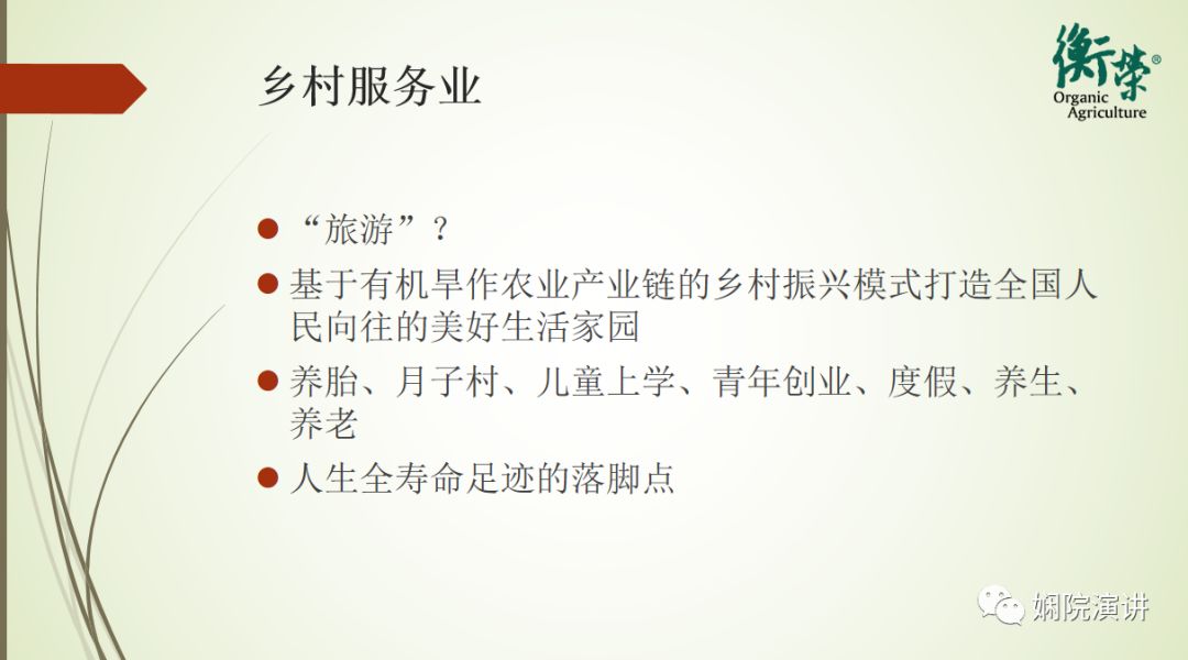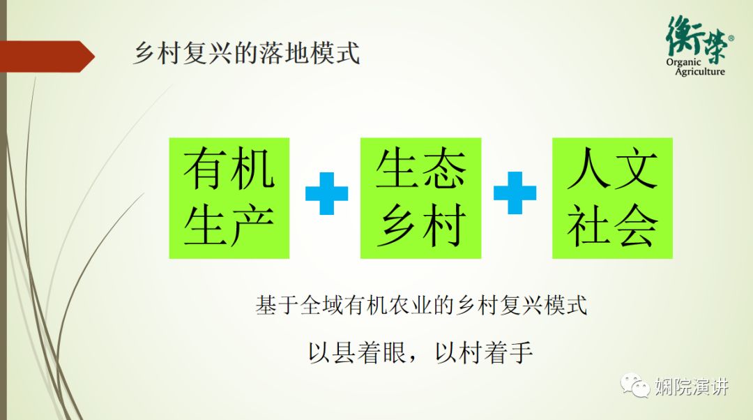 就是基于全域有机农业的乡村复兴模式,就是在村里面要实现全域有机生产、生态乡村建设和人文社会回归,以县着眼,以村着手来三位一体同步落地,这个事儿就有门了。