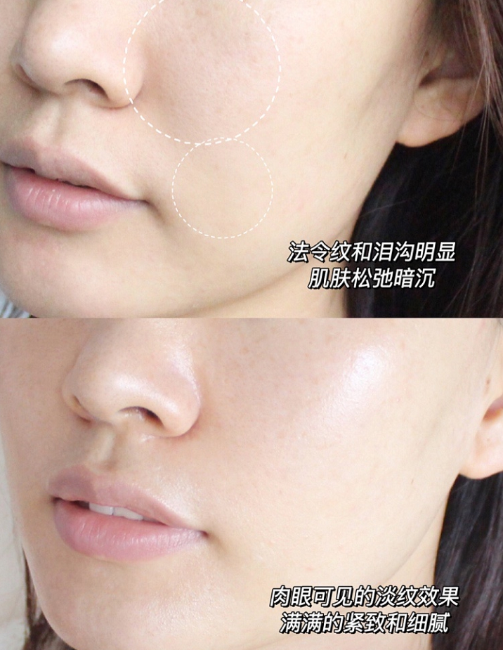 用了一个月下来,皮肤变化就很明显了。肌肤紧实度有提升,法令纹和泪沟改善不少,不再是脸蛋垮垮的状态!