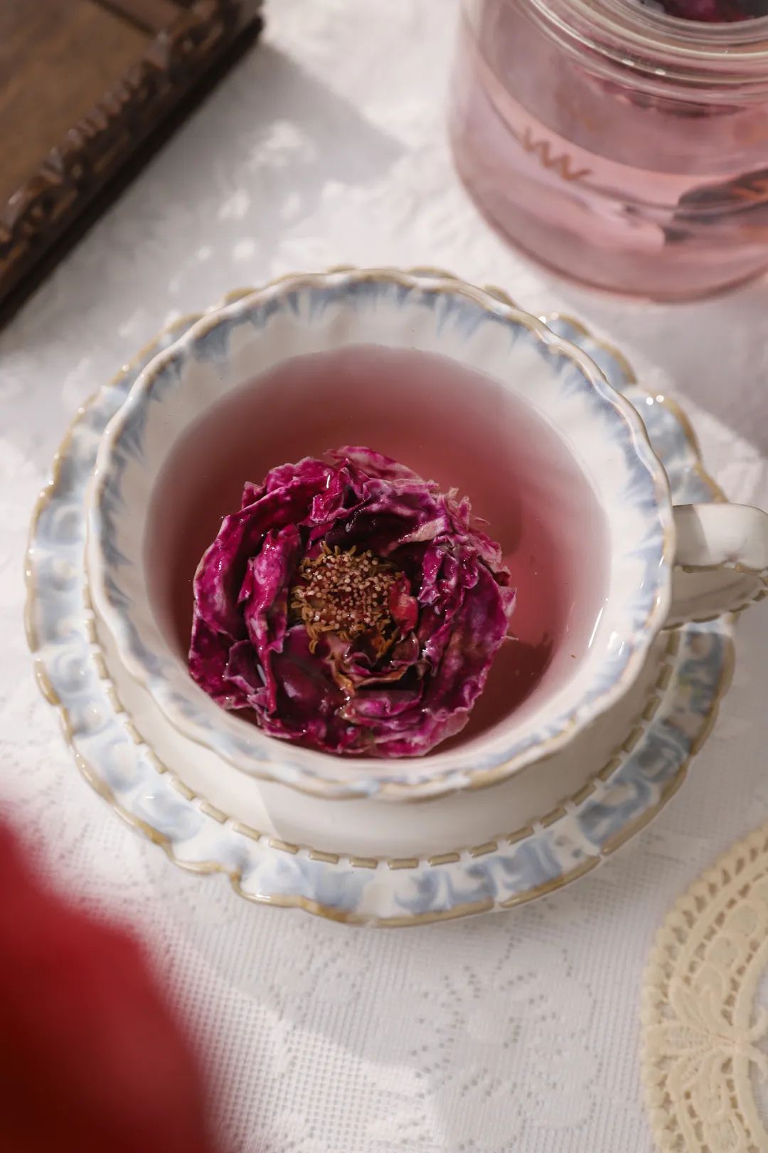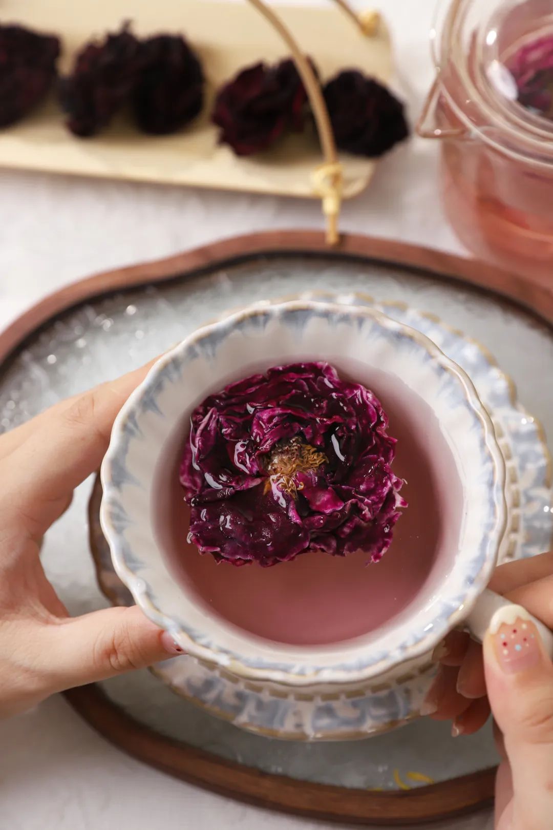 这一朵墨红玫瑰足有半个手掌这么大,一朵就是冲泡一杯的量,浓烈的花香伴随着微甜的回甘,是女孩子可以为之心动无数次的养生花茶。