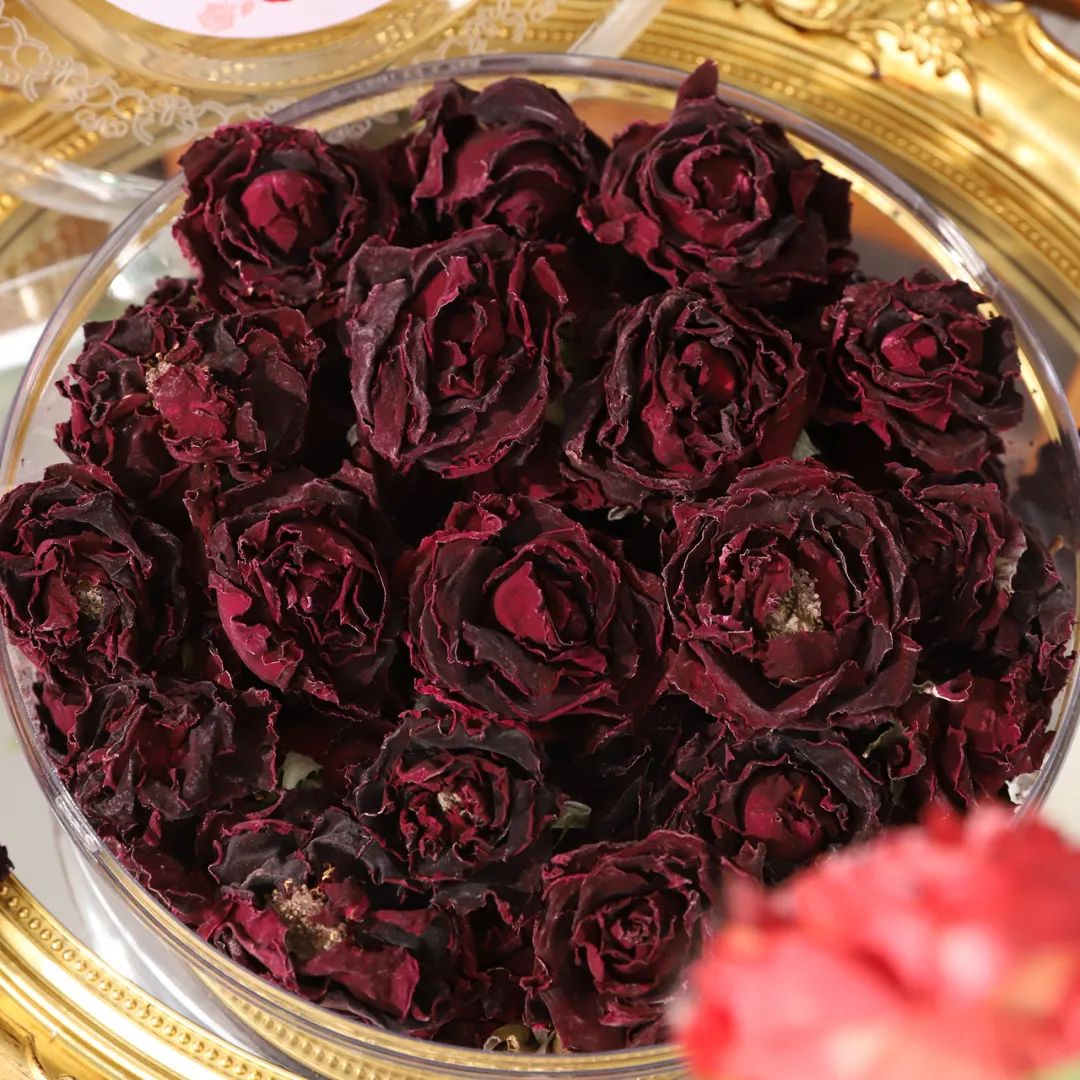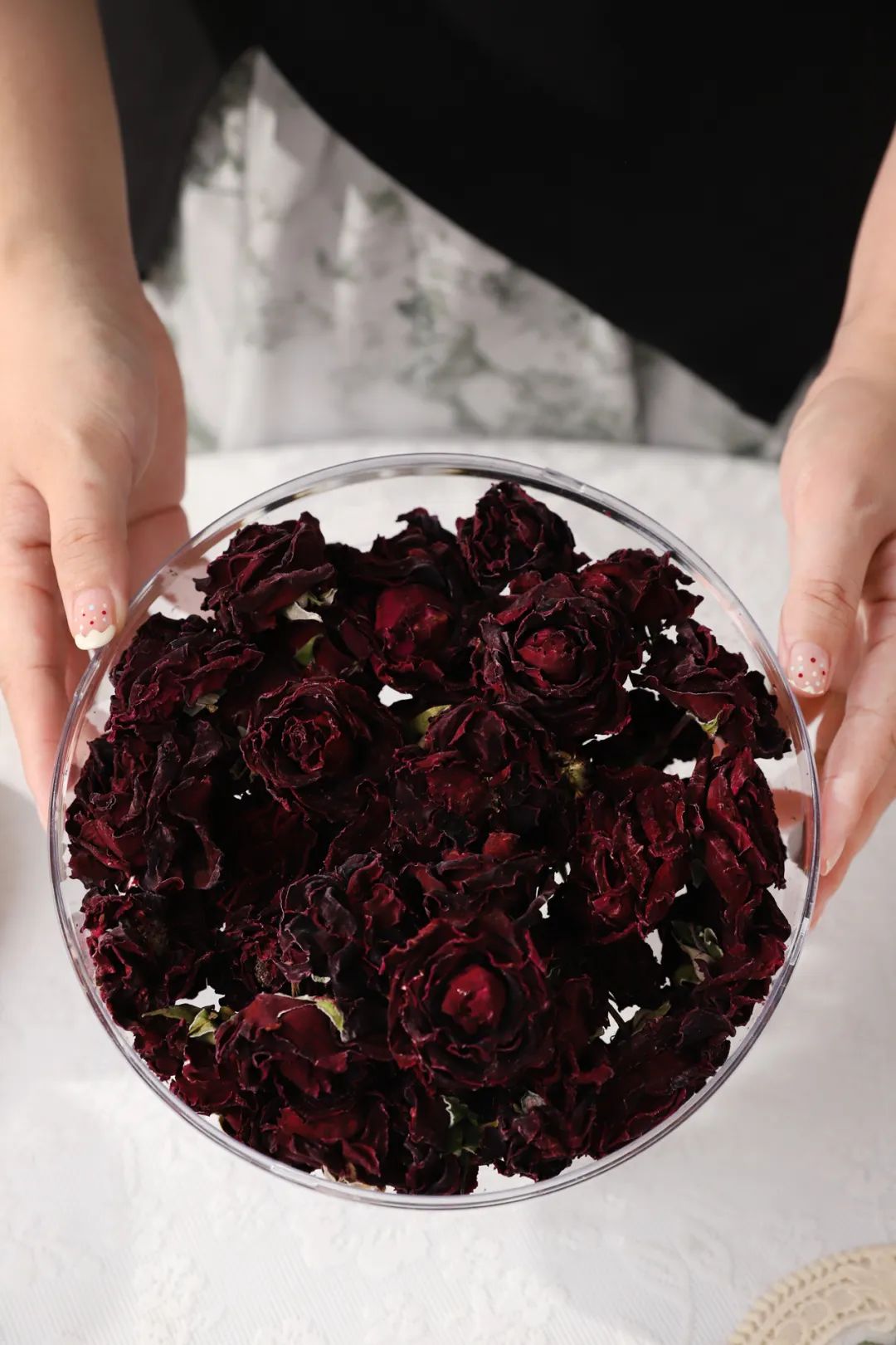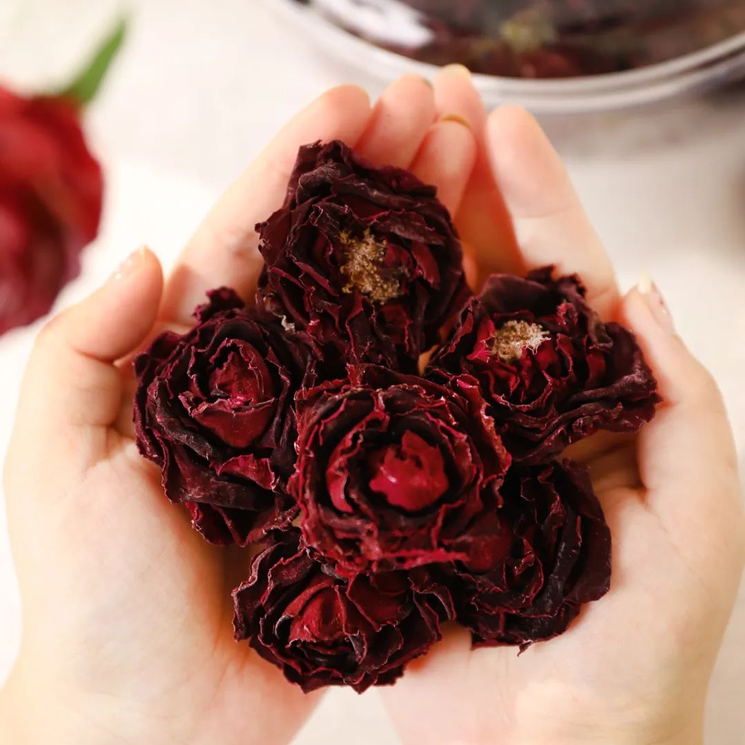 真空冻干使墨红玫瑰快速冻结,真空冰状脱水,相比传统的微波烘干,烤干,花型保留更完整、挥发物损失更少、活性营养保留更高,是更高标准的玫瑰花处理技术。