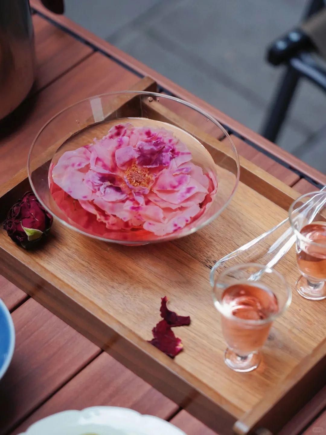 一壶水一朵花,看深红色丝绒质感的玫瑰花瓣在水中层层叠叠的打开,简直美得想像个艺术品,空气中花香浓郁仿佛打翻了一瓶玫瑰精油。