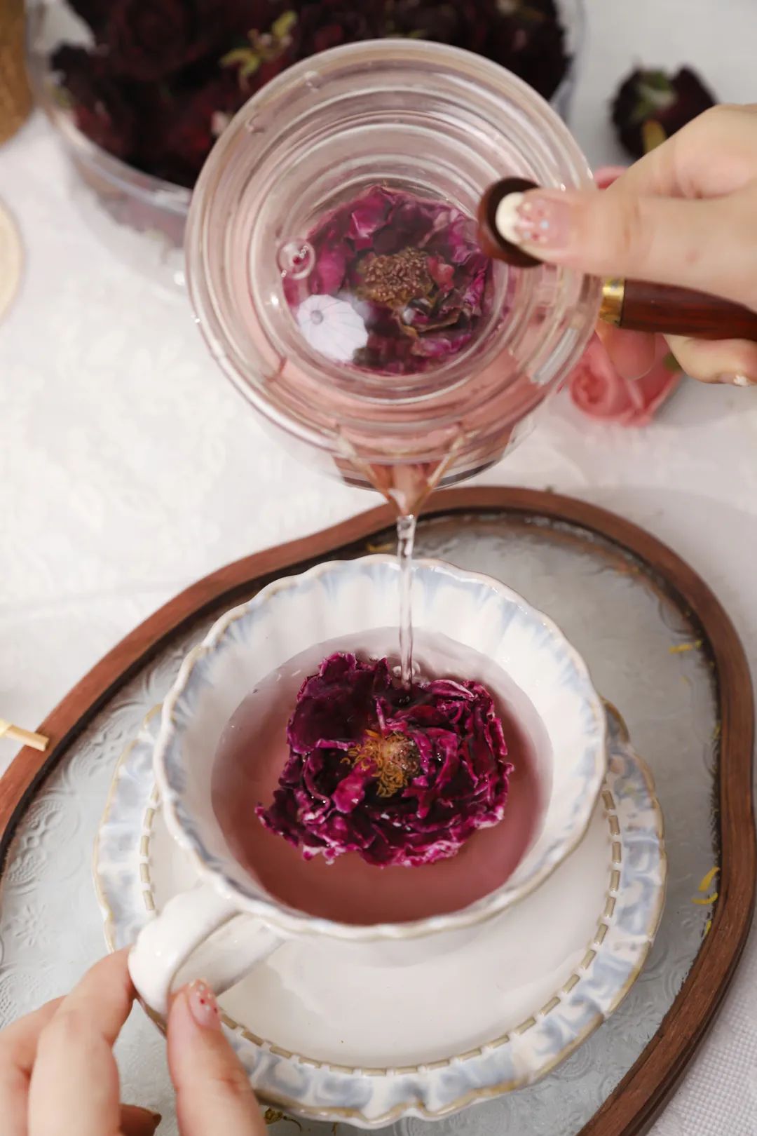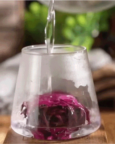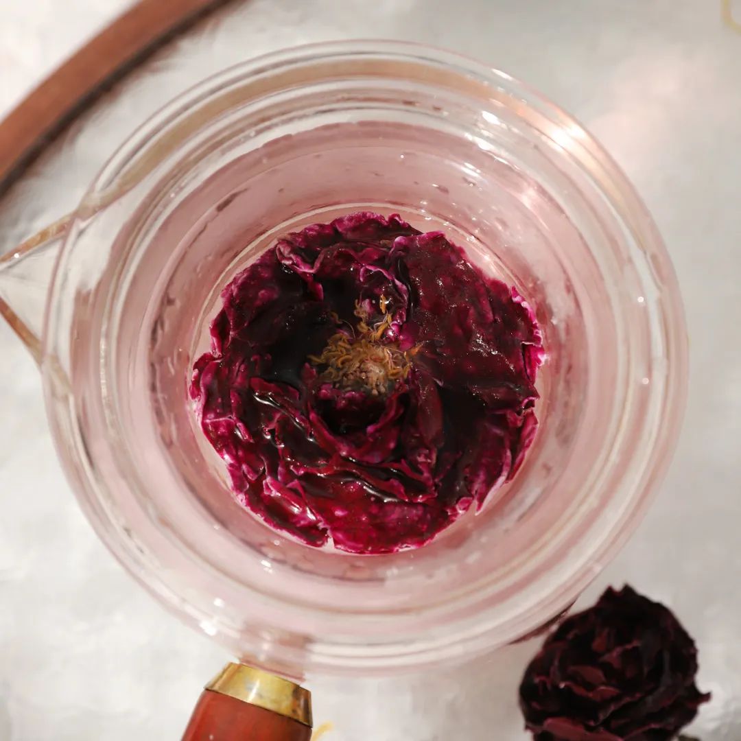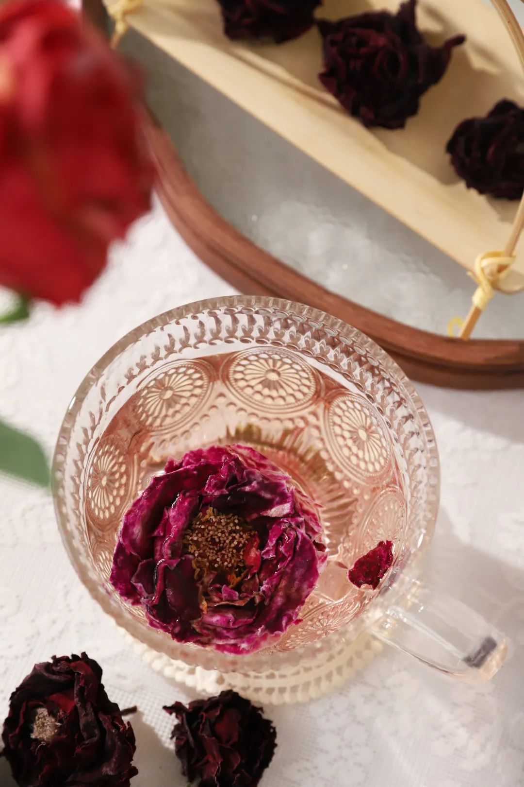 此时, 墨红玫瑰花会在水中缓慢绽放,香气馥郁,滋味清甜,生津持久,泡的越久韵味越足。