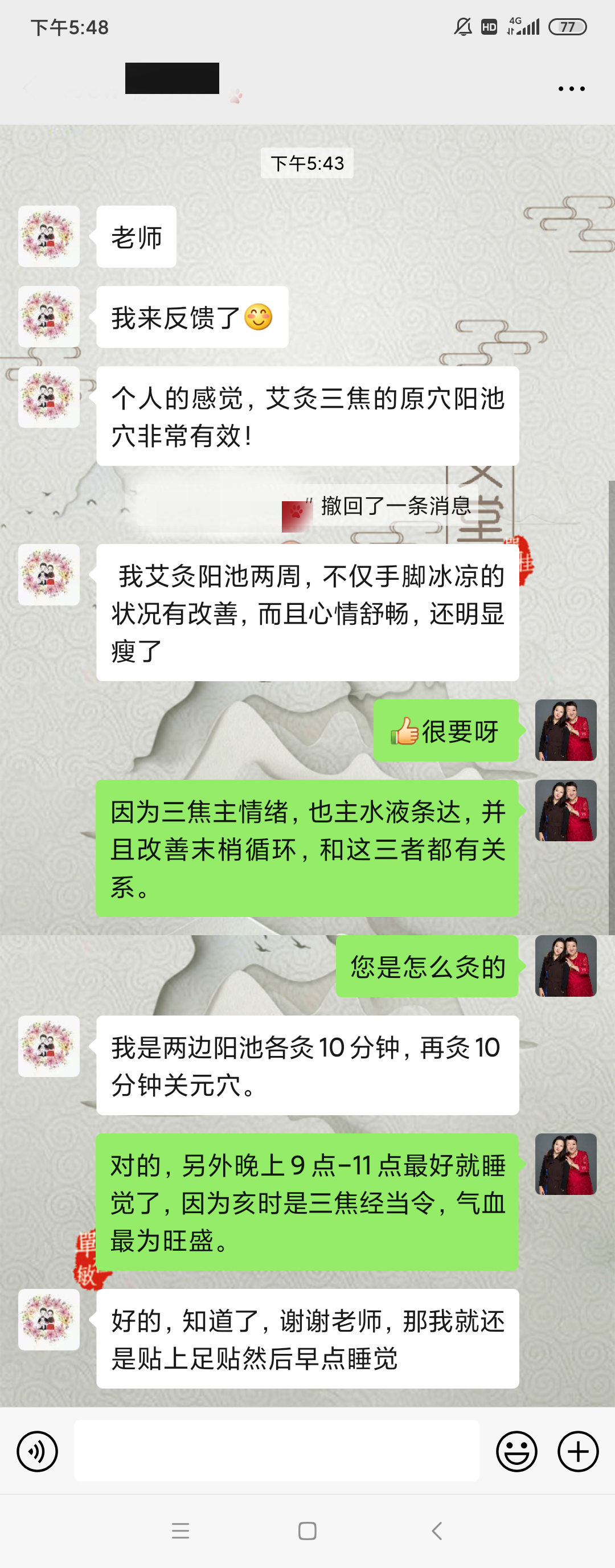 此外,还可以通过艾灸的方式来打通三焦经,分享一个灸友的经历: