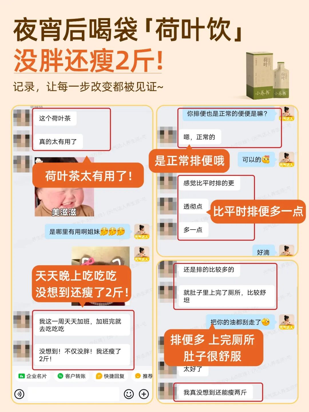 后来我建议她每次吃完大餐可以来一袋荷叶饮,她听了我的建议,有一周加班多,每次夜宵后,都会来一袋荷叶饮,有时候也会随餐喝,喝完第二天排便会比以往不喝的时候多些,结果没想到那吃吃喝喝的一周,因为每次都喝了荷叶饮,不仅没有胖,反而还瘦了2斤。